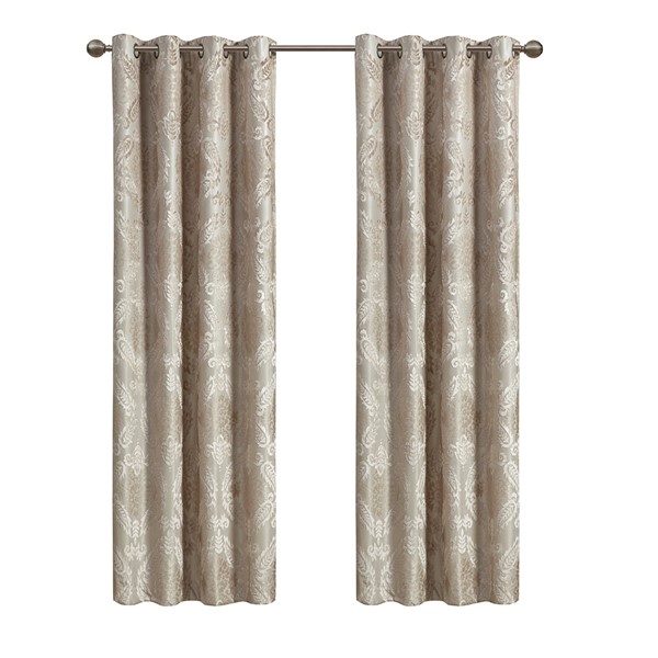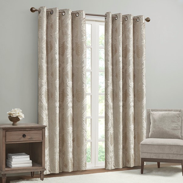 Our SunSmart Amelia Knitted Jacquard Paisley Total Blackout Grommet Top Curtain Panel adds the perfect touch of traditional elegance to your home. This total blackout champagne curtain features an intricate paisley design on a heavy textured jacquard fabric, providing a rich and luxe sheen for beautiful texture and dimension. The foamback and bonding finish on the reverse makes this curtain 100% total blackout, blocking out all exterior light and noise intrusion for maximum privacy while also using thermal layer technology for energy efficiency and maximum energy savings.