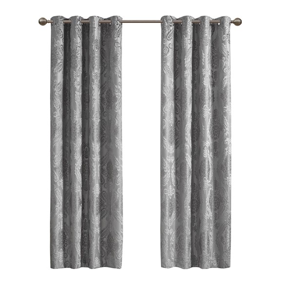 Our SunSmart Amelia Knitted Jacquard Paisley Total Blackout Grommet Top Curtain Panel adds the perfect touch of traditional elegance to your home. This total blackout grey curtain features an intricate paisley design on a heavy textured jacquard fabric, providing a rich and luxe sheen for beautiful texture and dimension. The foamback and bonding finish on the reverse makes this curtain 100% total blackout, blocking out all exterior light and noise intrusion for maximum privacy while also using thermal layer technology for energy efficiency and maximum energy savings. A silver grommet top finish makes this panel easy to hang, open, and close throughout the day; grommets fit up to a 1.25 inch diameter rod. As shown in image, 2 curtain panels will need to be purchased to provide coverage for any standard size window since this panel is sold as a single.
