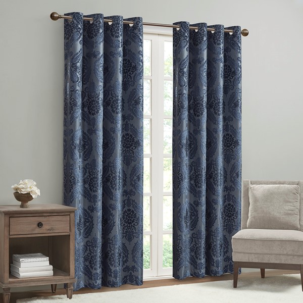Our SunSmart Amelia Knitted Jacquard Paisley Total Blackout Grommet Top Curtain Panel adds the perfect touch of traditional elegance to your home. This total blackout navy curtain features an intricate paisley design on a heavy textured jacquard fabric, providing a rich and luxe sheen for beautiful texture and dimension. The foamback and bonding finish on the reverse makes this curtain 100% total blackout, blocking out all exterior light and noise intrusion for maximum privacy while also using thermal layer technology for energy efficiency and maximum energy savings.