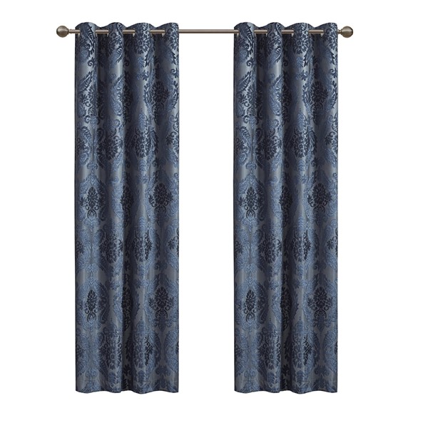 Our SunSmart Amelia Knitted Jacquard Paisley Total Blackout Grommet Top Curtain Panel adds the perfect touch of traditional elegance to your home. This total blackout navy curtain features an intricate paisley design on a heavy textured jacquard fabric, providing a rich and luxe sheen for beautiful texture and dimension. The foamback and bonding finish on the reverse makes this curtain 100% total blackout, blocking out all exterior light and noise intrusion for maximum privacy while also using thermal layer technology for energy efficiency and maximum energy savings.