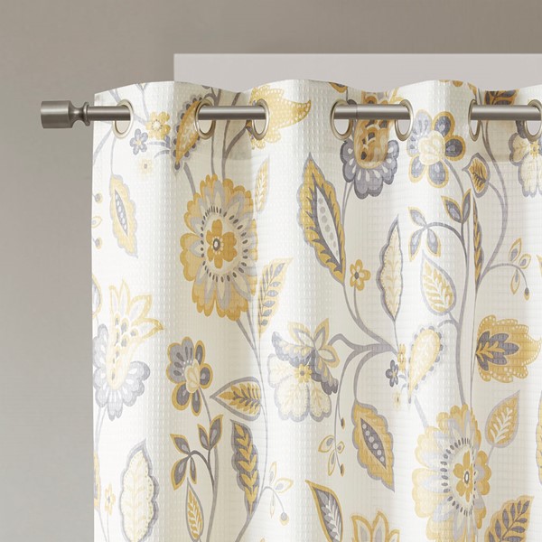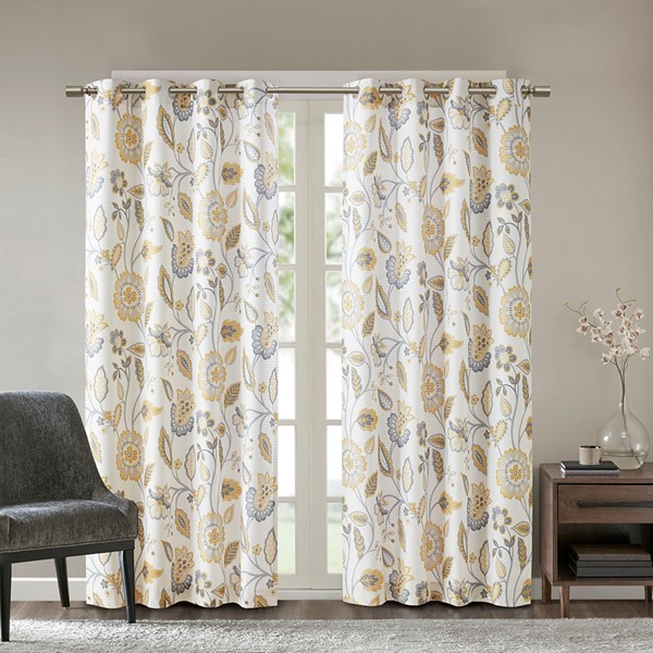 Beautifully frame your window with the stylish and functional SunSmart Camille Printed Room Darkening Curtain. A floral design in deep yellow, grey, and taupe hues is printed on a white dobby jacquard fabric creating texture and sheen for beautiful dimension and charm. Featuring a one pass foamback finish, this window panel provides a room darkening effect to soften harsh sunlight, while also serving as an effective barrier to dampen outside noise. In addition, this window panel is also OEKO-TEX certified, meaning it does not contain any harmful substances or chemicals, ensuring quality comfort and wellness. Silver grommets at the top make it easy to hang, open, and close throughout the day; fits up to a 1.25" diameter rod. Offering a moderate level of added privacy with nominal energy savings, this room darkening window panel brings a casual update to your home while creating a low ambiance lighting level, perfect for dining rooms, living rooms, or hallways.