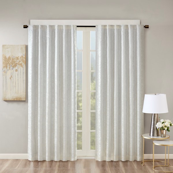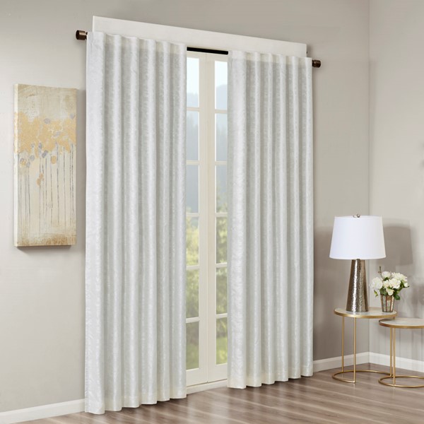 SunSmart Cassius Jacquard Total Blackout Panel is the perfect update to your windows, with its stunning beauty and functional style. This elegant window panel flaunts a marble jacquard design in rich white and silver hues creating a luxurious sheen, for a lavish look. A high-quality woven lining blocks out all sunlight, provides a maximum protective barrier against noise intrusion, and offers a maximum level of privacy and energy savings. With 100% total blackout properties, this window panel is the perfect addition for bedrooms, media rooms, or any private spaces. These blackout curtains are also OEKO-TEX certified, meaning they do not contain any harmful substances or chemicals, for quality comfort and wellness. The rod pocket top and back tabs create a clean finish to your window giving your home a gorgeous touch of luxury. Fits up to a 1.25" diameter rod. Lighting level: Pitch Black Ambiance. Complete the look with coordinating valance, sold separately.