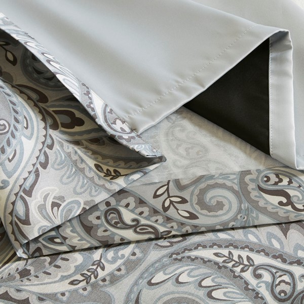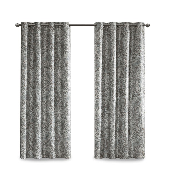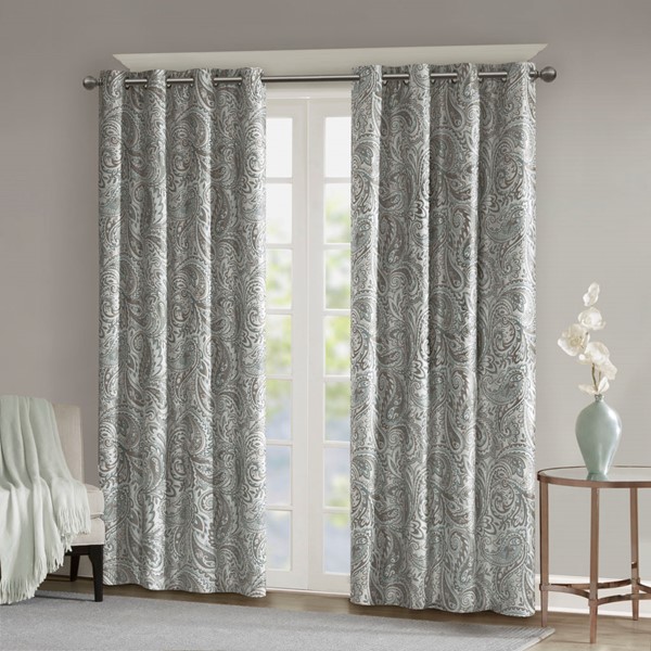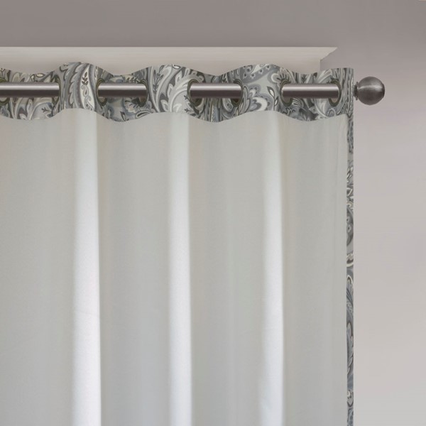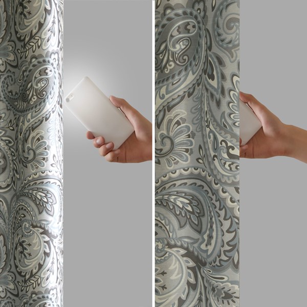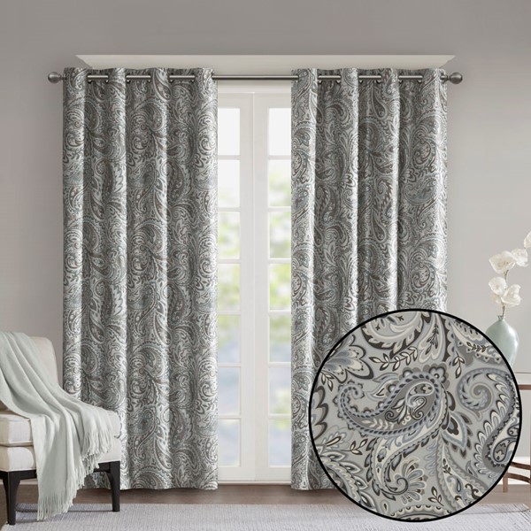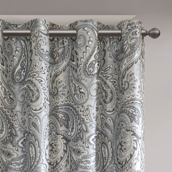 Our SunSmart Jenelle Paisley Printed Total Blackout Window Panel offers a stunning and stylish update to your home, while embracing simple functionality. This curtain features a beautiful paisley print in soft grey hues, combined with a light sheen faux silk base fabric for an elegant and transitional look. An added full blackout lining blocks out all outside light and creates a maximum protective barrier against noise and intrusion to ensure the highest level of privacy. Using thermal technology, this window panel helps provide maximum energy saving by keeping your room cool or warm as needed. Grommet top makes this panel easy to hang, open, and close through the day. This 100% total blackout window panel is perfect for bedrooms, media rooms, or any private space, providing a lighting level of pitch black ambiance when fully closed. Fits up to a 1.25" diameter rod.