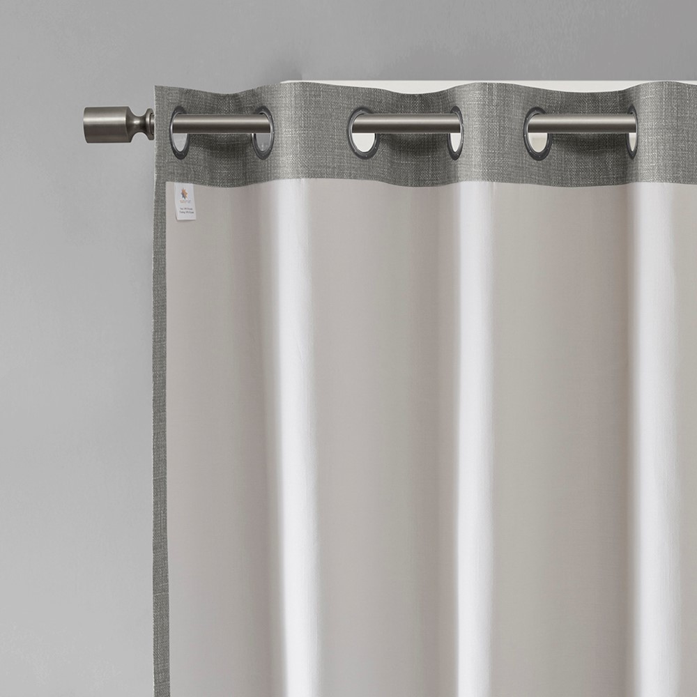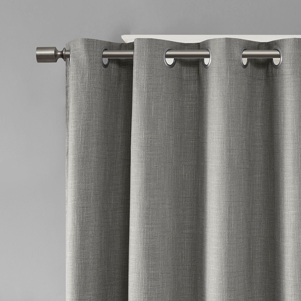 Energy efficiency meets chic casual style, with our SunSmart Maya Printed Heathered Blackout Panel. Featuring a printed heathered design in a cool grey hue, this blackout window panel is made from a textured polyester slub base fabric creating beautiful texture and dimension. A one pass foamback finish with additional bonding is added and enhances the panel to buffer most sunlight, while also creating a significant barrier to reduce outside noise. The silver grommet top makes it easy to hang, open, and close the window panel throughout the day; fits up to a 1.25″ diameter rod. Perfect for home offices, family rooms, and bedrooms – this blackout panel provides considerable energy savings and a high-level of privacy by bringing a heavily shaded lighting level to any room.