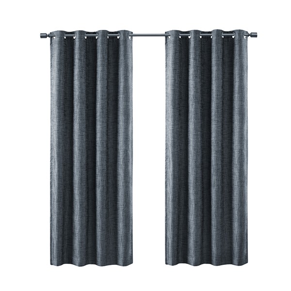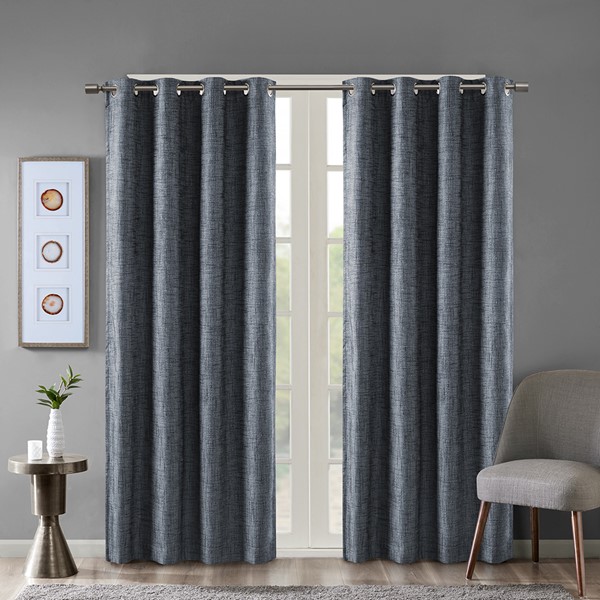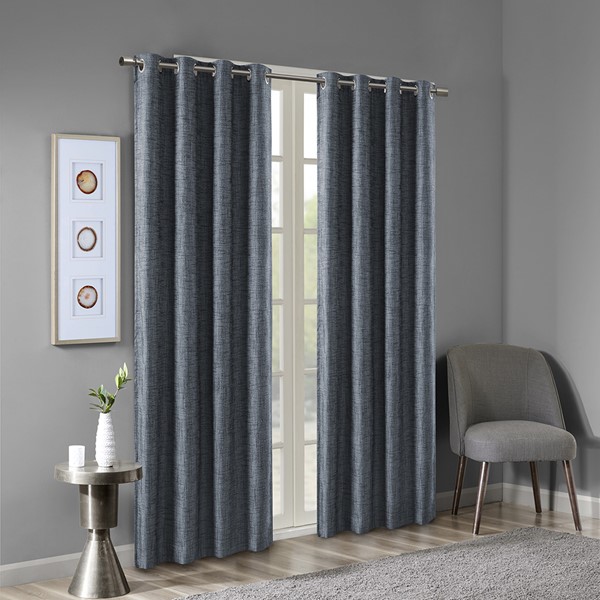 Energy efficiency meets chic casual style, with the SunSmart Maya Printed Heathered Blackout Panel. Featuring a printed heathered design in navy hue, this blackout window panel is made from a textured polyester slub base fabric creating beautiful texture and dimension. A one pass foamback finish with additional bonding is added and enhances the panel to buffer most sunlight, while also creating a significant barrier to reduce outside noise. The silver grommet top makes it easy to hang, open, and close the window panel throughout the day; fits up to a 1.25" diameter rod. Perfect for home offices, family rooms, and bedrooms – this blackout panel provides considerable energy savings and a high-level of privacy by bringing a heavily shaded lighting level to any room.