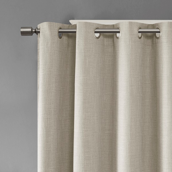Energy efficiency meets chic casual style, with our SunSmart Maya Printed Heathered Blackout Panel. Featuring a printed heathered design in a warm taupe hue, this blackout window panel is made from a textured polyester slub base fabric creating beautiful texture and dimension. A one pass foamback finish with additional bonding is added and enhances the panel to buffer most sunlight, while also creating a significant barrier to reduce outside noise. The silver grommet top makes it easy to hang, open, and close the window panel throughout the day; fits up to a 1.25" diameter rod. Perfect for home offices, family rooms, and bedrooms – this blackout panel provides considerable energy savings and a high-level of privacy by bringing a heavily shaded lighting level to any room.