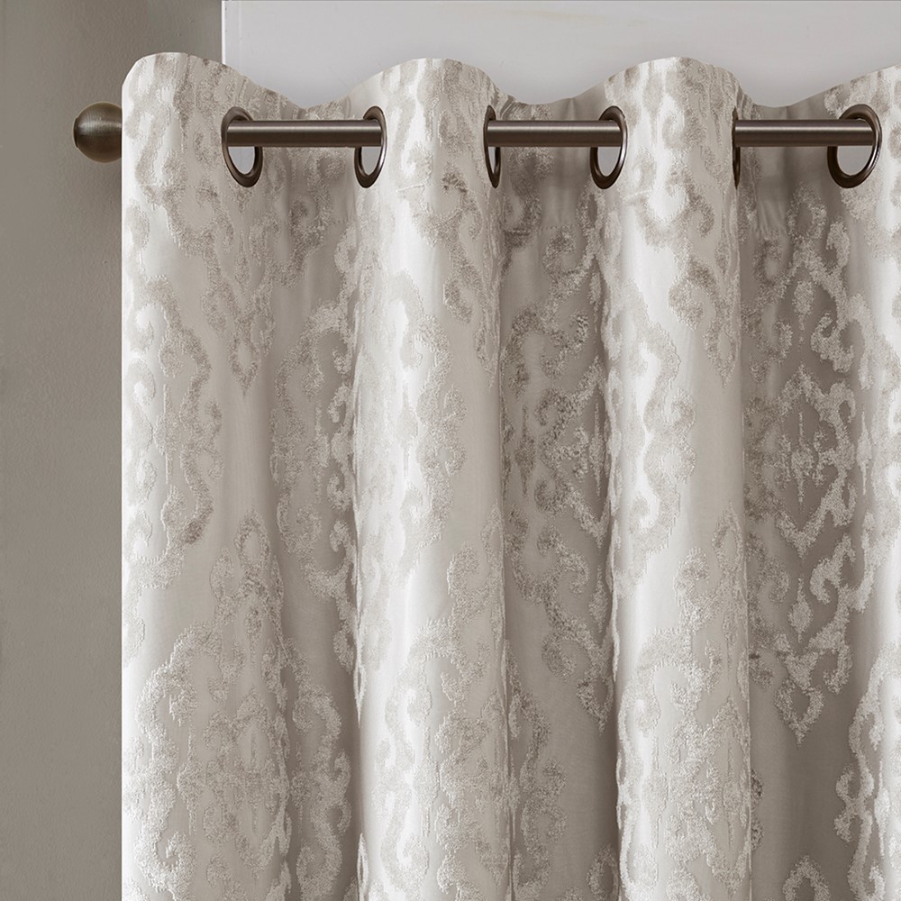 * Total blackout grommet top curtain panel in knitted jacquard damask design