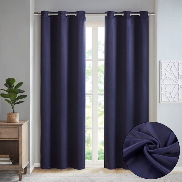 Create the perfect look in your home with the SunSmart Taren Blackout Triple Weave Panel Pair. This solid navy window panel pair features a triple weave to create a significant barrier against outside light and noise intrusion. It also offers considerable energy efficiency and savings with a high level of privacy. Easy to hang with the silver grommet top finish, this total blackout window panel pair is perfect for use in bedrooms, media rooms, or home offices. This window panel pair is also OEKO-TEX certified, meaning it does not contain any harmful substances or chemicals to ensure quality comfort and wellness. Fits up to a 1.25" diameter rod. Lighting level: Pitch Black Ambiance.