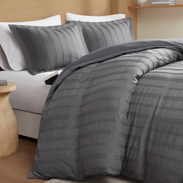 Super Listing Logan Striped Reversible Pintuck Pleated Duvet Set in Charcoal, King AM12-0581