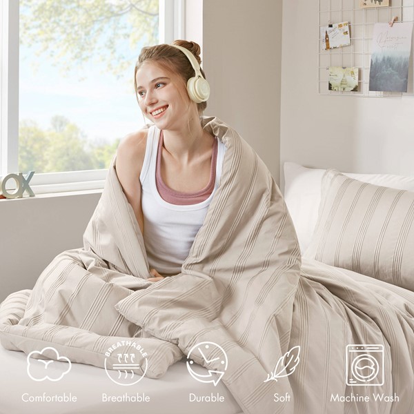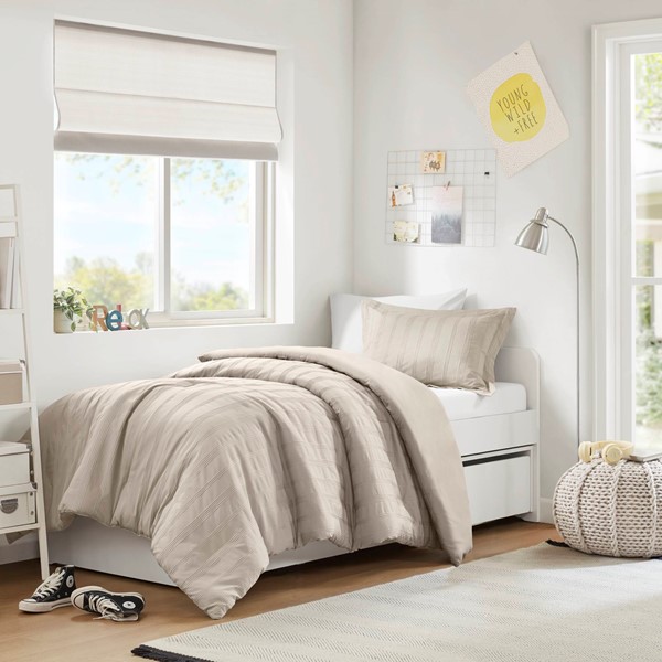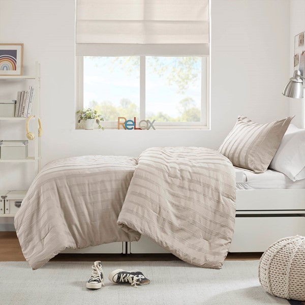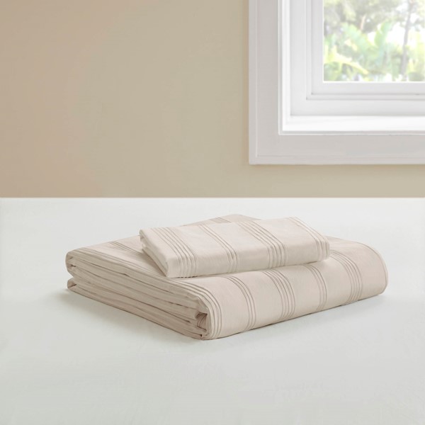 Super Listing Logan Striped Reversible Pintuck Pleated Duvet Set in Neutral, Twin/Twin XL AM12-0583