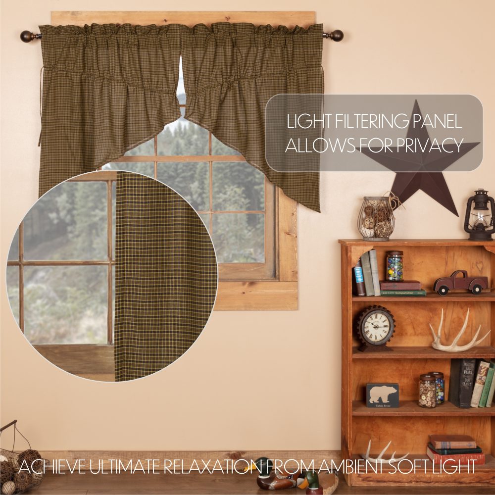 Decorate your windows with a touch of relaxed, rustic country style with this charmingly designed and thoughtfully crafted window swag set. Displaying a timeless country look with a classic plaid in olive tones of moss and muted chartreuse green with navy blue accents, the Tea Cabin Prairie Swag Set 36x36x18 enhances your home decor with a modern country feel. The gracefully angled drapes perfectly frame windows providing a bit of polish for your home. Our fully lined prairie swag panels come with built in drawstrings to adjust each panel to meet your style needs, along with a curtain rod pocket for easy hanging. Includes two matching panels for a perfectly dressed kitchen or living room window.