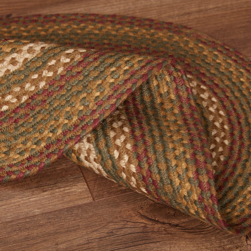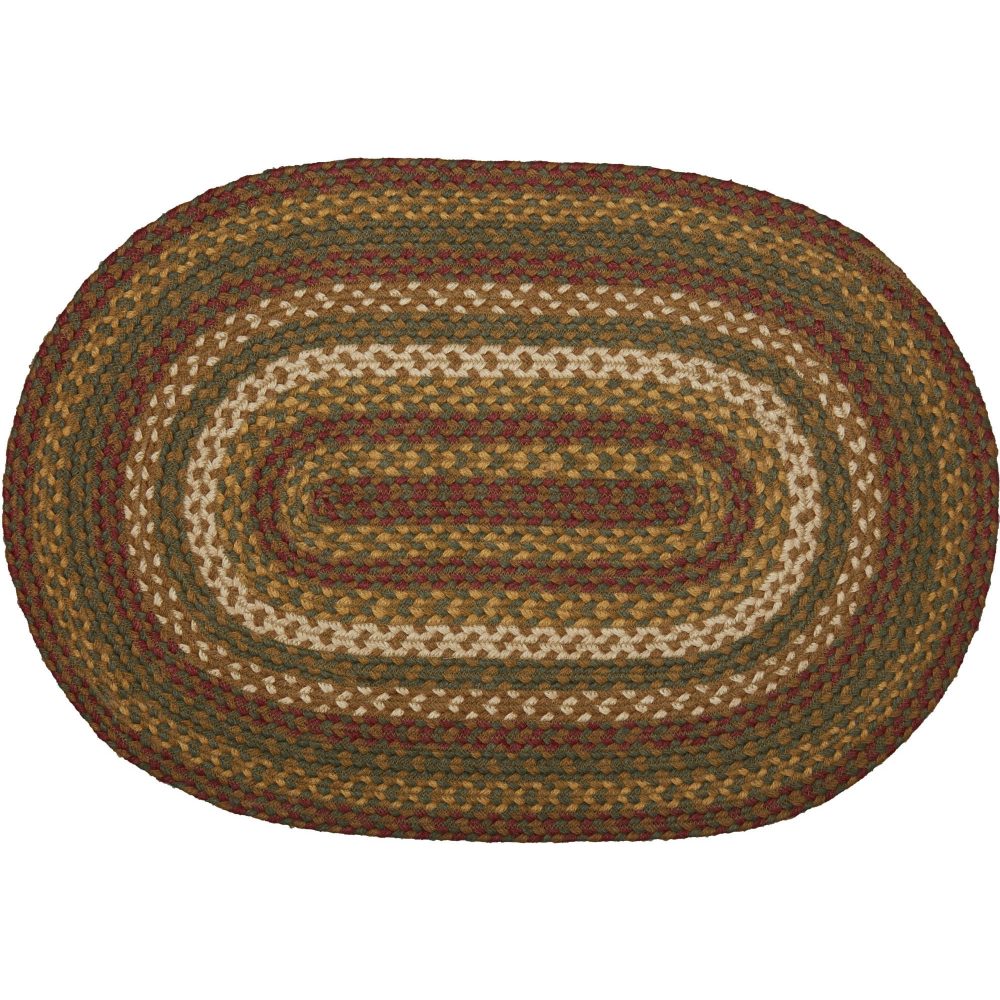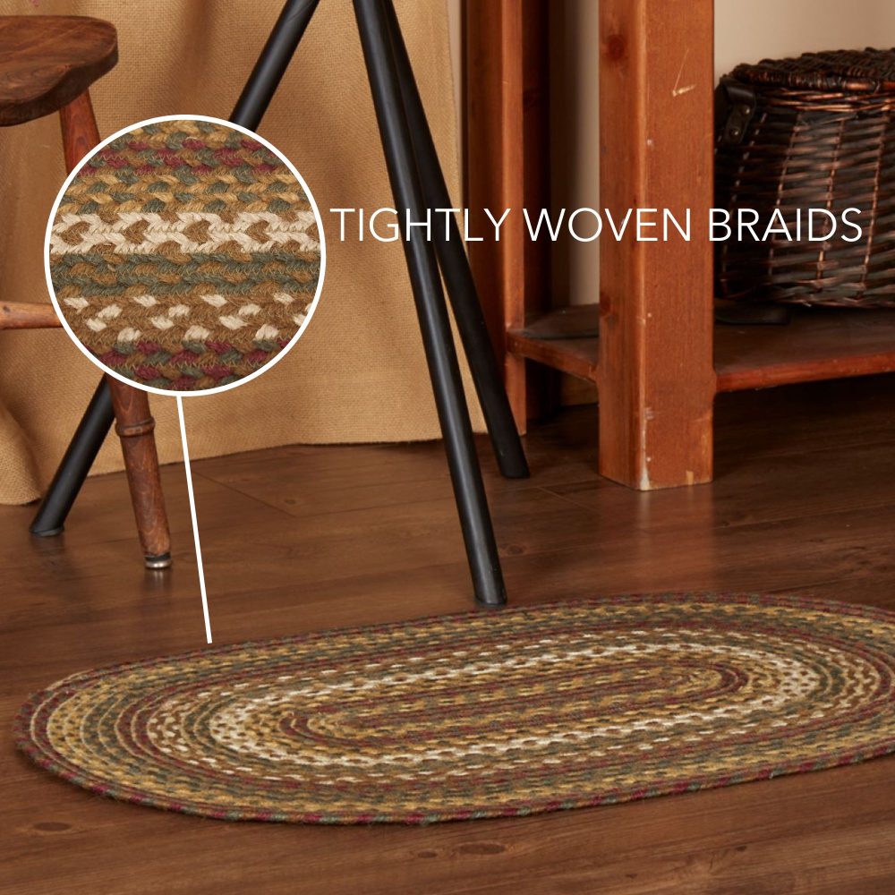 Create a warm, homey feeling with deep primitive colors in a curl-resistant jute blend that adds style and safety anywhere a small accent rug is needed. The Tea Cabin Jute Rug measures 20x30 inches and features a classic oval shape and tight braids constructed with a durable jute blend. The special blend relaxes faster and stays flat. Features a blend moss green, crimson red, and soft creme for a muted, rustic look that complements a wide array of primitive country decor.