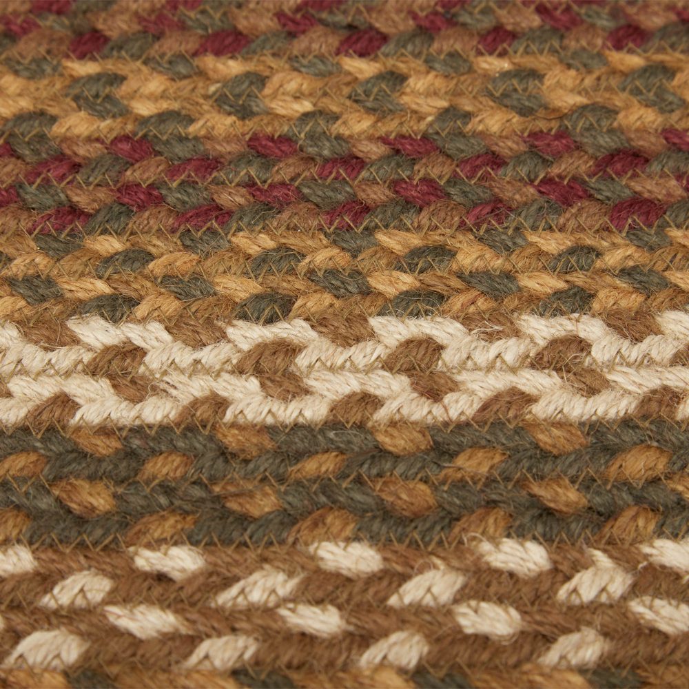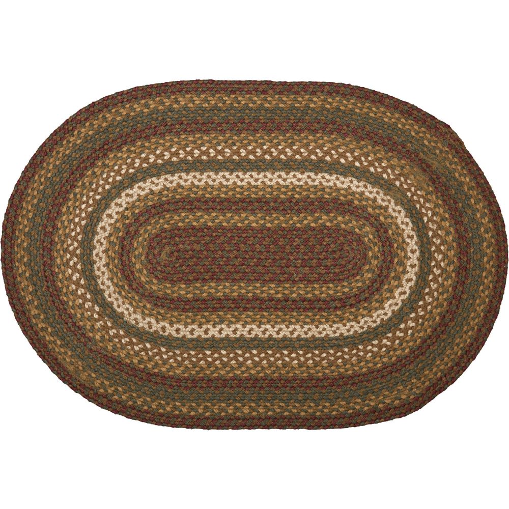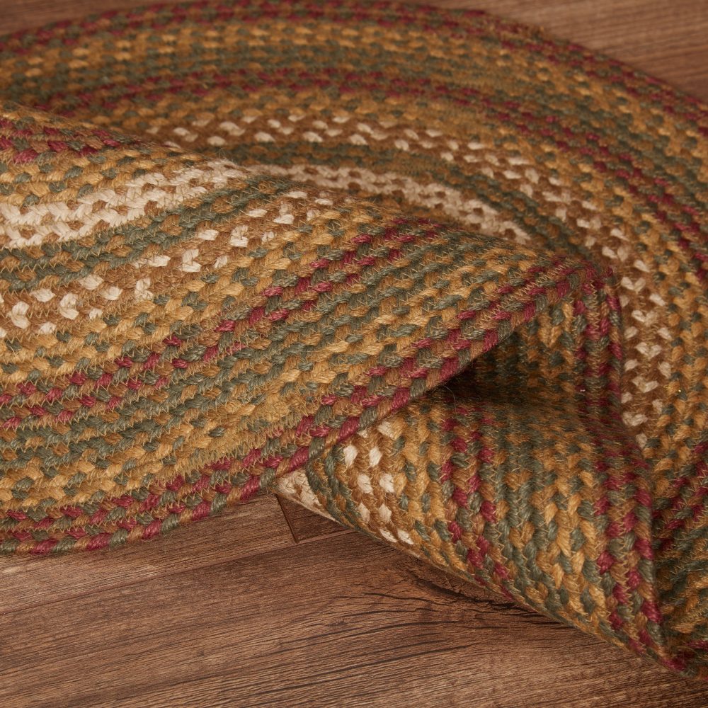 Create a warm, homey feeling with deep primitive colors in a curl-resistant jute blend that adds style and safety anywhere a mid-size accent rug is needed. The Tea Cabin Jute Rug measures 24x36 inches and features a classic oval shape and tight braids constructed with a durable jute blend. The special blend relaxes faster and stays flat. Features a blend moss green, crimson red, and soft creme for a muted, rustic look that complements a wide array of primitive country decor.