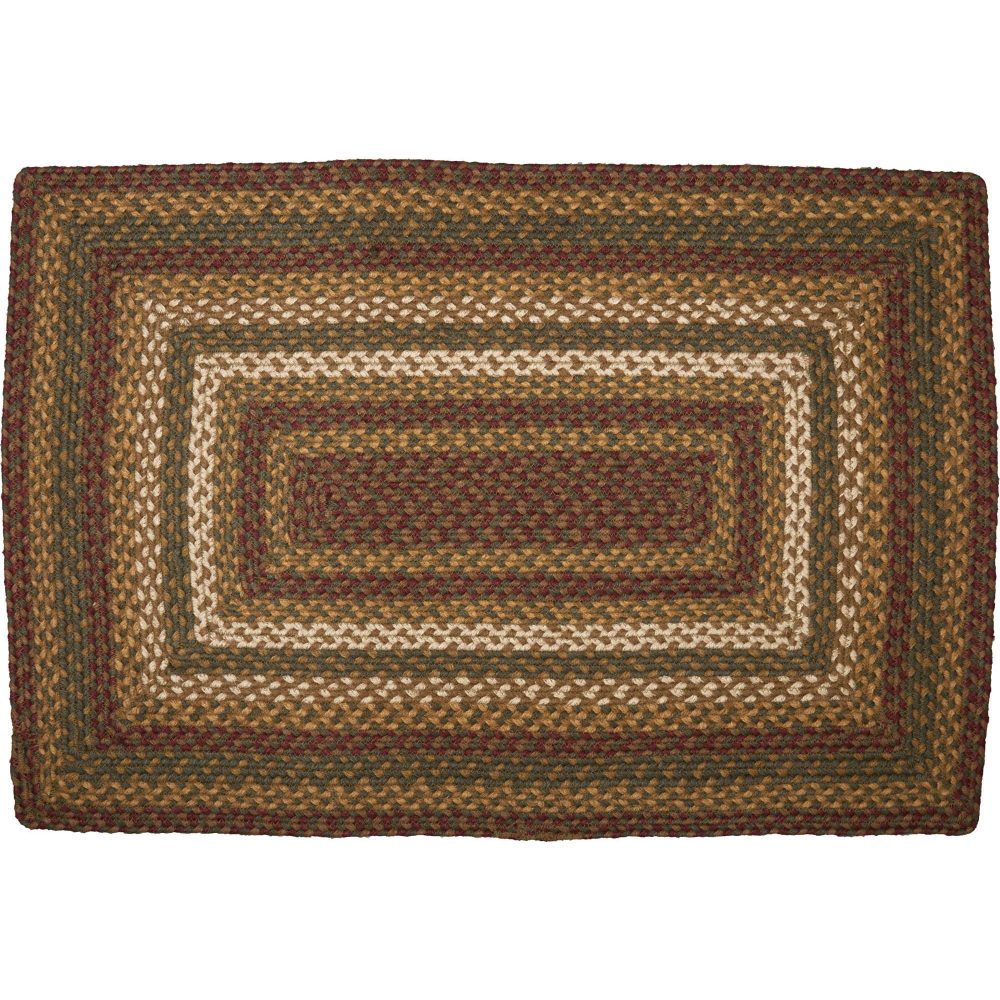 Create a warm, homey feeling with deep primitive colors in a curl-resistant jute blend that adds style and safety anywhere a mid-size accent rug is needed. The Tea Cabin Jute Rug measures 24x36 inches and features a classic rectangle shape and tight braids constructed with a durable jute blend. The special blend relaxes faster and stays flat. Features a blend moss green, crimson red, and soft creme for a muted, rustic look that complements a wide array of primitive country decor.