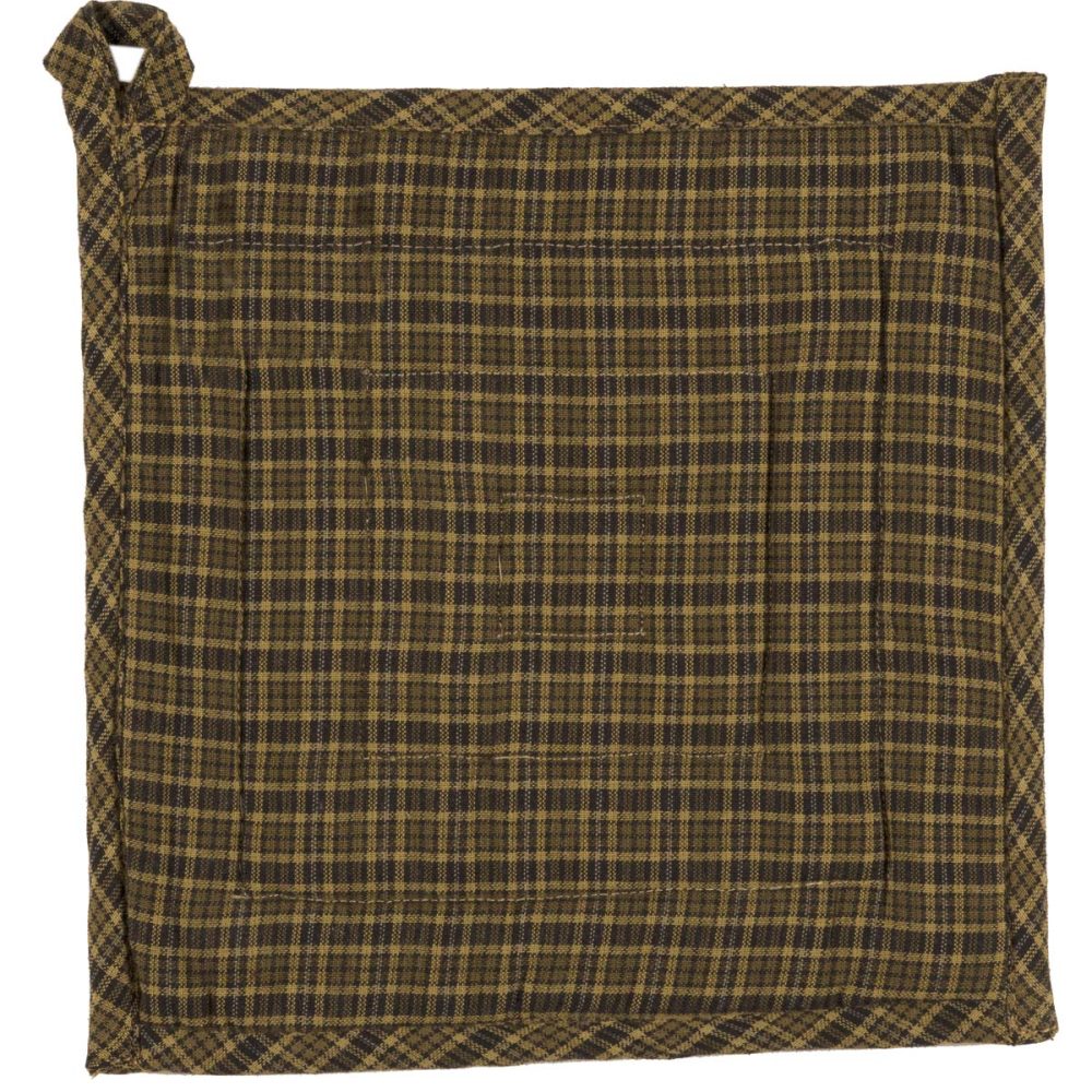 Protect your hands from hot pots and steaming pans with a unique, primitive country design. The Tea Cabin Pot Holder includes one 8x8 inch square pot holder in a unique patchwork design featuring green, red, blue and tan plaids. The top of the classic quilted pattern includes a traditional log cabin patchwork design that reverses to an olive green plaid. The high-quality pot holder includes a 100 percent cotton shell with a thick cotton batting to protect your hands from burns. The stylish kitchen accessory is machine washable and can easily be stored with a 1-inch loop to hang within easy reach of an oven or stovetop.