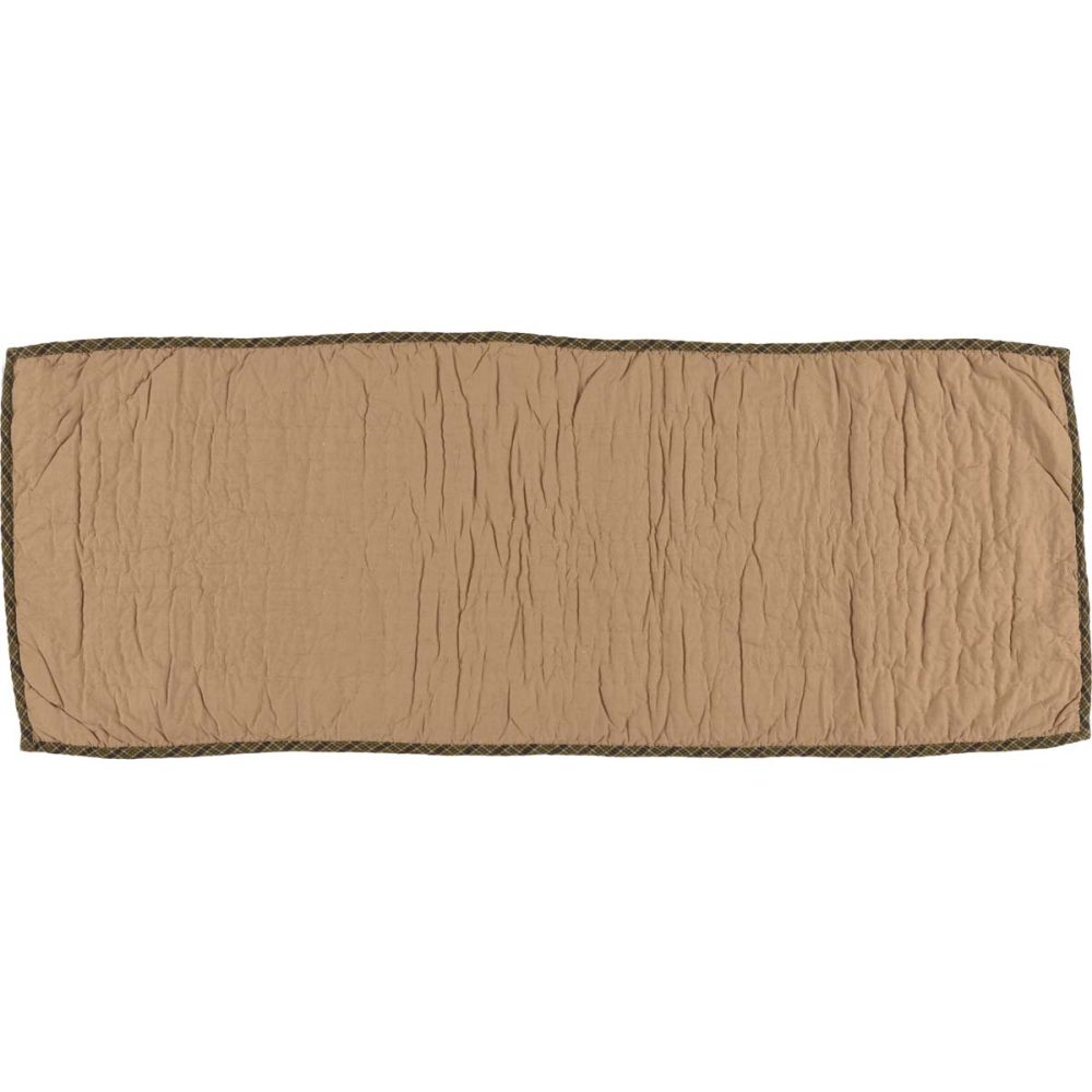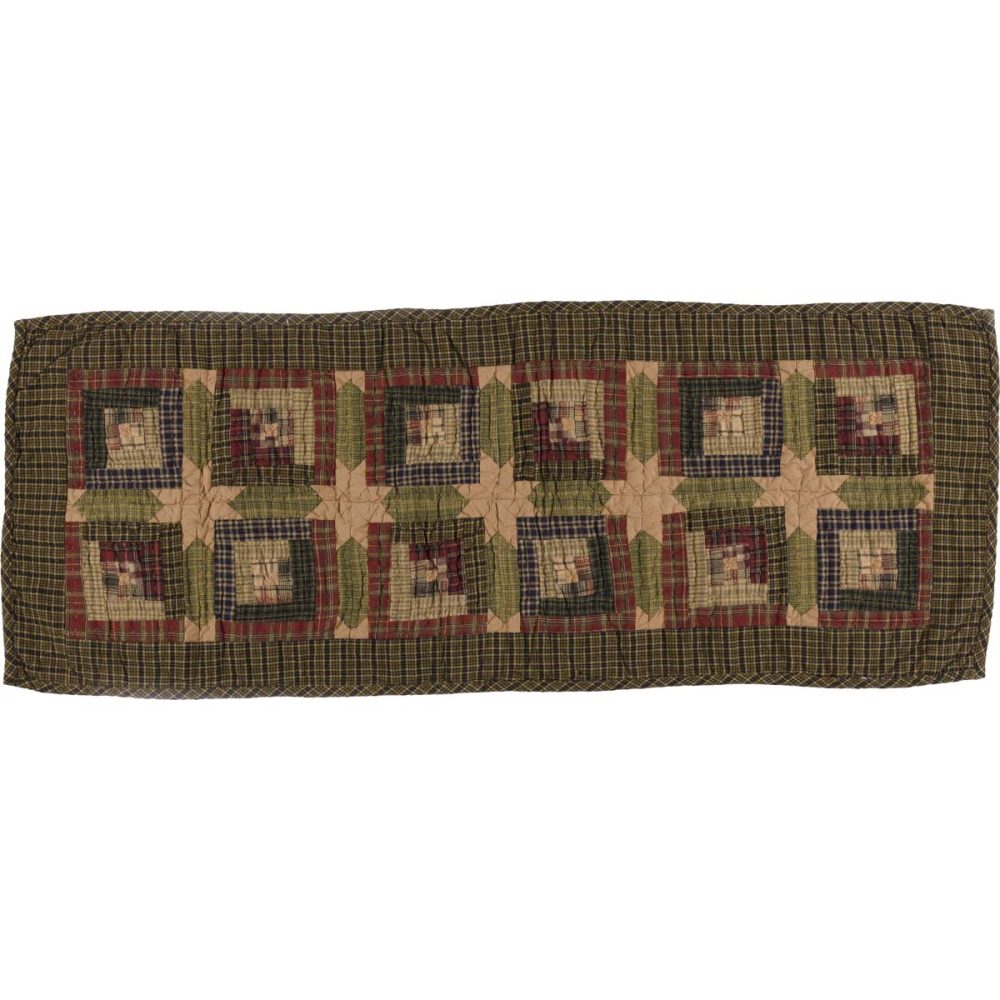 Create a warm and cozy table for friends and family to gather round with a charming rustic patchwork design. The Tea Cabin Runner includes one table runner measuring 13x36 inches. The rich texture and straight edging of the cotton fabric is given a rustic feel with a muted tones of moss green, dark khaki tan and deep red in tartan plaid patterns. A rustic quilted cross design with log cabin detailing adds a primitive cabin look. Complete your tabletop decor with other pieces from the Tea Cabin Collection by VHC for rustic cabin style.