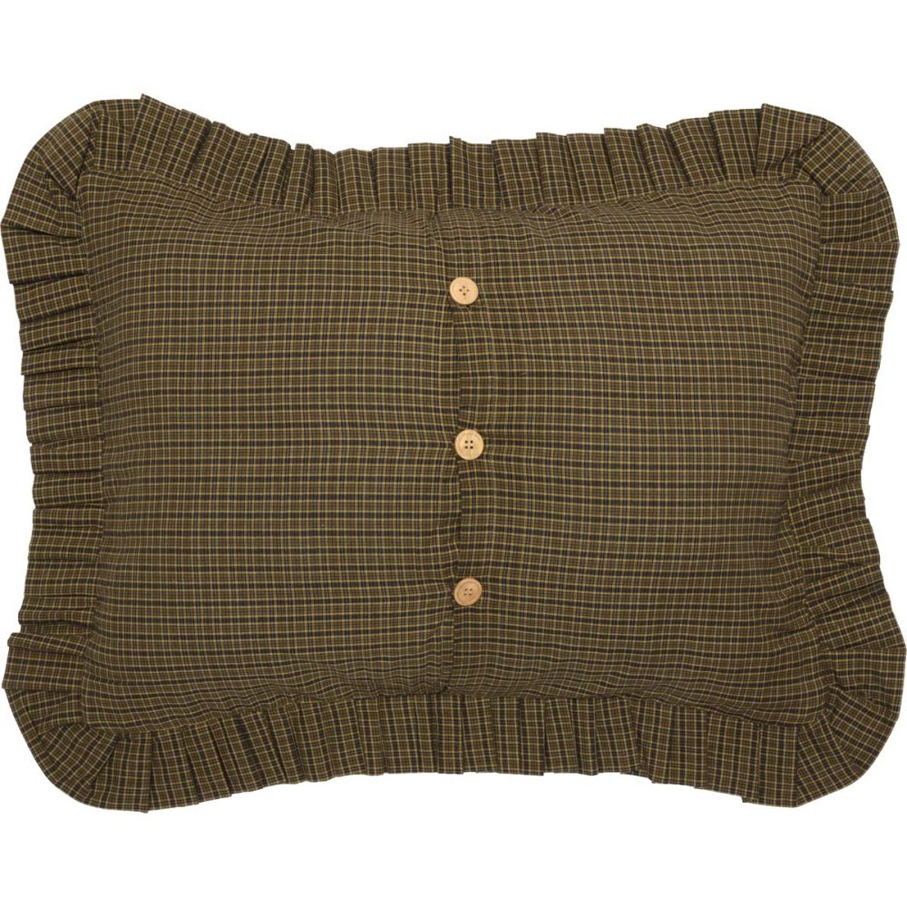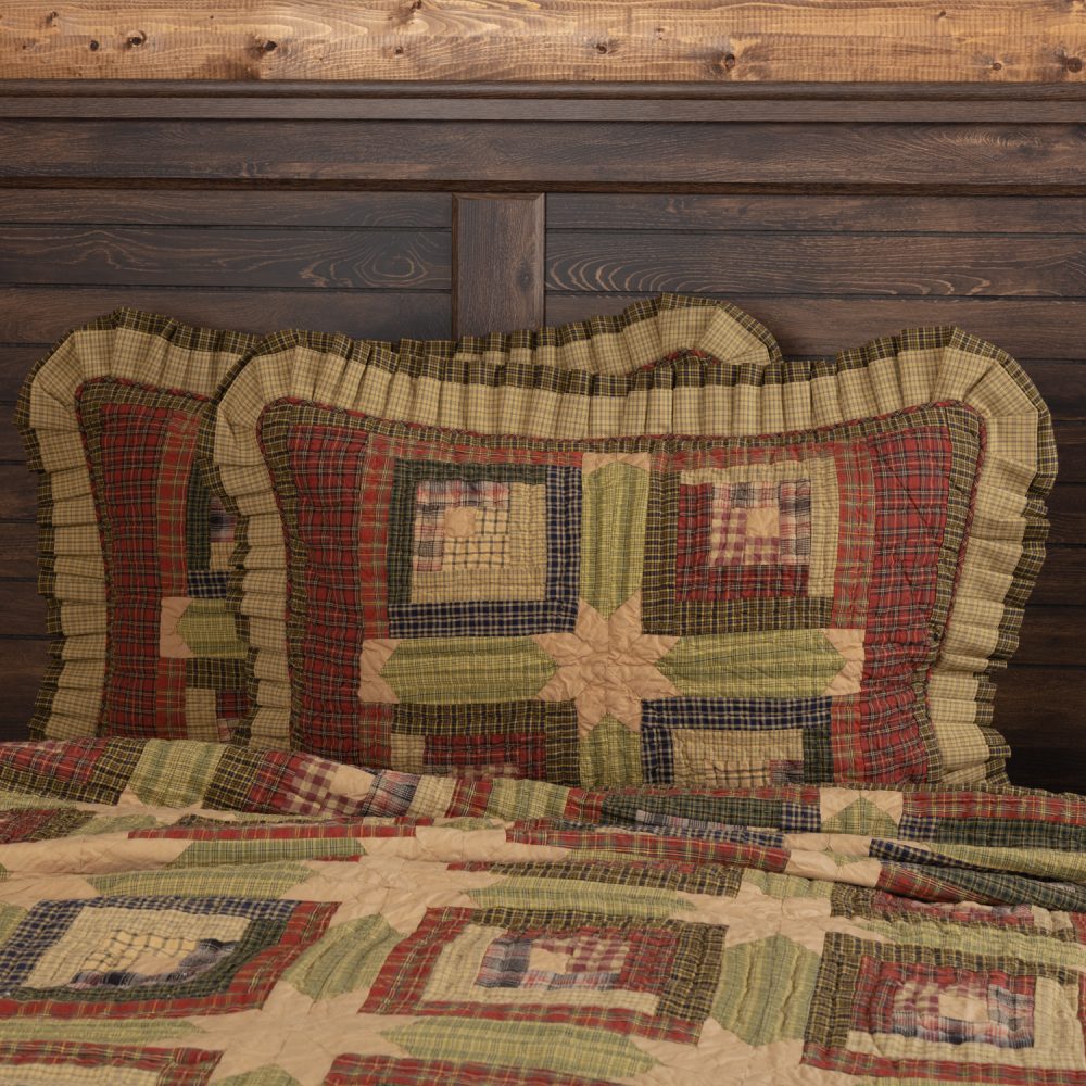 Add an elegant, unique design to your rustic country decor with calming shades of moss green, dark khaki tan and deep red. The Tea Cabin Standard Sham measures 21x27 inches and features a mix of traditional plaid patterns in shades of olive green and dark red in log cabin blocks surrounding unique eight-point star accents for a primitive, relaxed feel. Add it to bedding, couches or chairs for warmth and style that transforms your space with a timeless country cottage look. Machine washable and iron safe. Includes button-style closures for easy removal and a wide, double-ruffle edge for a sophisticated French country style. Does not include fill pillow.