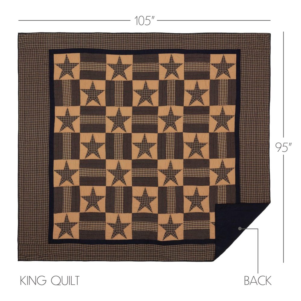 The Teton Star King Quilt patchwork decor mixes navy and khaki fabrics in a stars and bars vintage layout. Proudly displaying traditional 5-point stars alternating with patchwork blocks in navy blue and tan finished with triple borders. Reverses to solid navy blue.