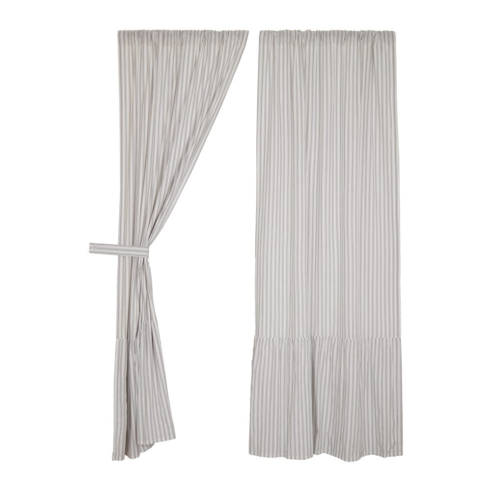 Nothing says farmhouse chic quite so well as the perfectly tailored stripes of our Timeless Ticking fabric. In this classic pattern, a stripe is flanked by thinner stripes on either side, feathering out the look of the stripe, to create a delicate and pleasing fade. Dove Gray combines with restful, creamy white in a familiar repeating design that is visually calming and relaxed. Softness abounds with these playful, flirty Ruffled Drapes, adding no end of stylish charm to your farmhouse windows. The casually elegant fabric brings comfortable, old-fashioned, vintage style to your home easily. The fully lined curtains add layers of lush softness and the generous ruffle with a pretty, scalloped edge offers true feminine appeal. Hanging loops and a rod pocket provide different display options and are reinforced with an additional layer of fabric for greater stability and durability. A pair of matching fabric tiebacks is included. The set includes 2 drapes.