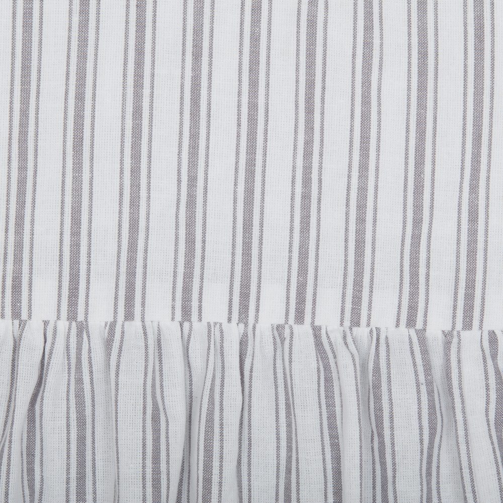 Nothing says farmhouse chic quite so clearly as the perfectly tailored stripes of our Timeless Ticking fabric. In this classic design, one main stripe is flanked by thinner stripes on either side, feathering out the look, creating a softly tailored style. Dove Gray combines with restful, creamy white in a classic striped pattern that is calming, charming, and familiar. Nonstop farmhouse style with a feminine flair is easily achieved when you bring home this fresh and casually elegant ticking fabric, enhanced with generous ruffles. The bedding brings softness and flirty flounce with layers of fabric and gently-gathered ruffles that cascade toward the floor from the top of the mattress. The lush flowing ruffle creates volume and dimension. Cozy cotton voile backs the ticking fabric, ensuring the softest, most snugly fabric is next to your skin, and a lining of comfortable, brushed flannel completes the ensemble, combining to create cloud-like layers of warm, luxurious fabric.