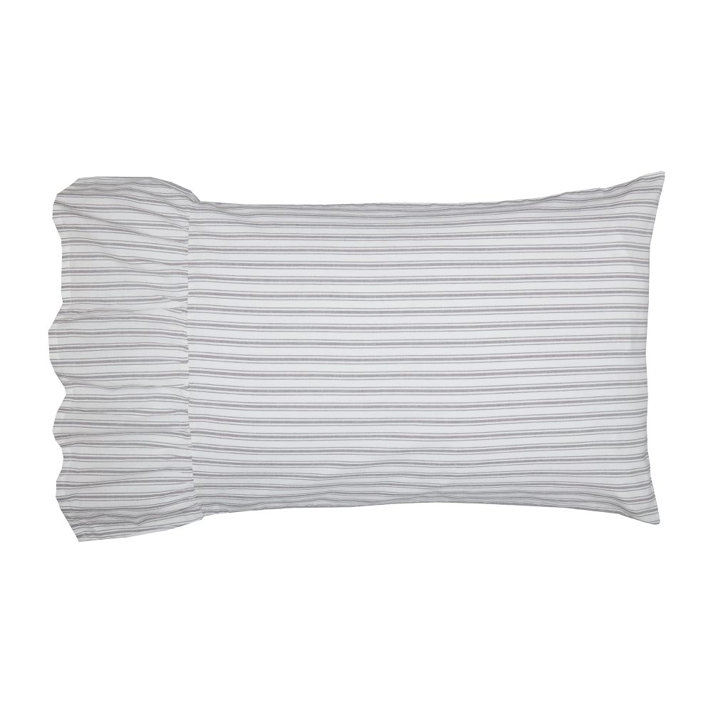 Nothing says farmhouse chic quite so clearly as the perfectly tailored stripes of our Timeless Ticking Collection. In this classic design, one main stripe is flanked by thinner stripes on either side, feathering out the look, creating a soft, visually pleasing pattern. Dove Gray combines with restful, creamy white in a classic striped design that is calming and familiar, charming and comfortable. Nonstop farmhouse style with a feminine flair is easily achieved when you bring home this fresh and casually elegant ticking fabric, enhanced and softened with generous ruffles. The Standard Shams add a lovely layer of softness and flirty flounce to your vintage farmhouse or upscale cottage bedroom. A gently-gathered, generous 8 ruffle surrounds the open edge of the pillow cover.. The classic striped fabric and feminine ruffles add no end of cozy, luxurious charm to your updated bedding ensemble.