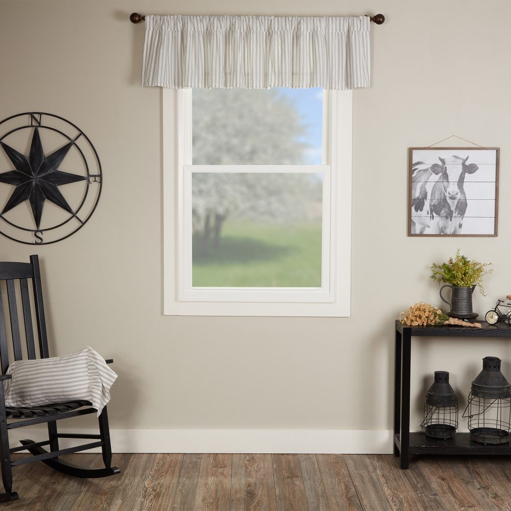 Nothing says farmhouse chic quite so well as the perfectly tailored stripes of our Timeless Ticking fabric. In this classic pattern, one stripe is flanked by thinner stripes on either side, feathering out the look, to create a delicate and pleasing fade. Dove Gray combines with restful, creamy white in a familiar repeating design that is visually calming and relaxed. Softness abounds with this playful, flirty Ruffled Valance, adding no end of softness and charm to your farmhouse windows. The casually elegant fabric brings comfortable, old-fashioned, vintage style to your home and the generous ruffle creates lovely feminine appeal. Fabric loops and a rod pocket provide different display options and are reinforced with an additional layer of fabric for greater stability. Display with other Timeless Ticking fabrics, repeating the design throughout your home for your own signature style. Also coordinates well with other collections, especially Farmhouse Ticking Gray.