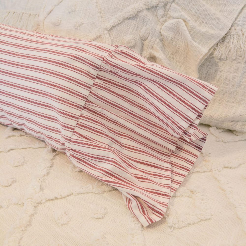 Nothing says farmhouse chic quite so clearly as the perfectly tailored stripes of our Timeless Ticking fabric. In this classic design, one main stripe is flanked by thinner stripes, feathering the look in a softly tailored style. True red combines with restful, creamy white in a classic striped pattern that brings instant vintage good looks. Softness abounds with this playful, flirty Ruffled Pillow cover, adding no end of stylish charm to your vintage farmhouse or upscale cottage. The long 8 Ruffles offer feminine appeal and a romantic touch in layers of fabric that dress up two sides of the pillow cover. The accent reverses to the same fabric adding to the life and durability of the cover. A simple opening, without a zipper or buttons, on one side provides room for your insert. Create your own signature style with other Timeless Ticking fabrics in the holiday, seasonal or everyday collections, repeating the pattern throughout your home like a design boss.
