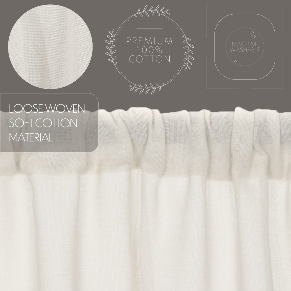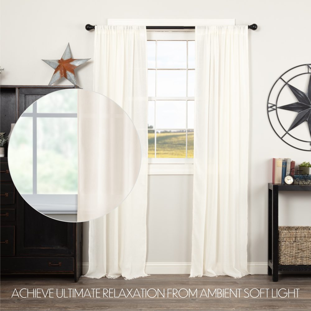 • FARMHOUSE PANEL: Includes two 84 by 40 inch panels crafted with sheer antique white cotton fabric with frayed bottom edging and a 3.25 rod pocket. Includes matching tie backs.