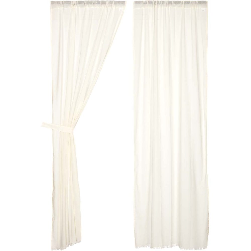 Let the light shine in while adding texture and polish to your home. The Tobacco Cloth Antique White Panel Fringed Set of 2 84x40 brings a light and airy farmhouse look with lightweight tobacco cloth. The sheer fabric softly filters light creating a perfectly welcoming and bright environment. Features frayed edging and a rod pocket for easy hanging. Includes matching tie backs.