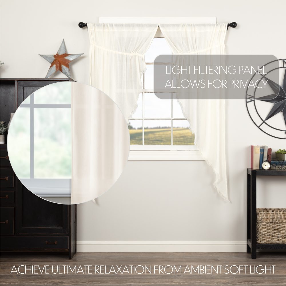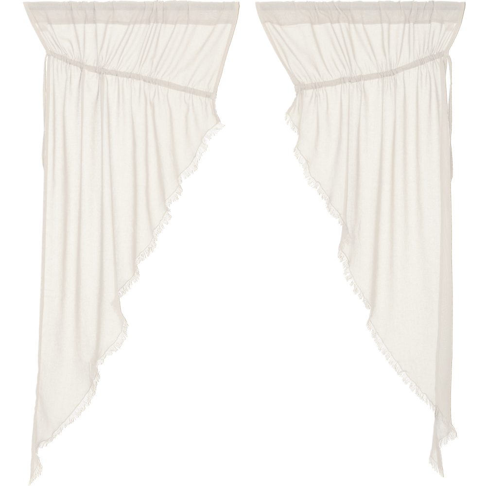 The Tobacco Cloth Antique White Prairie Short Panel Fringed Set creates a romantic cottage feel for your home. Featuring lightweight tobacco cloth in soft white with frayed edging, these curtains are a versatile choice for accenting farmhouse kitchens, laundry rooms, and more. The gracefully angled drapes perfectly frame windows providing a bit of polish for your home. Our unlined prairie panels come with built in drawstrings to adjust each panel to meet your style needs, along with a curtain rod pocket for easy hanging.