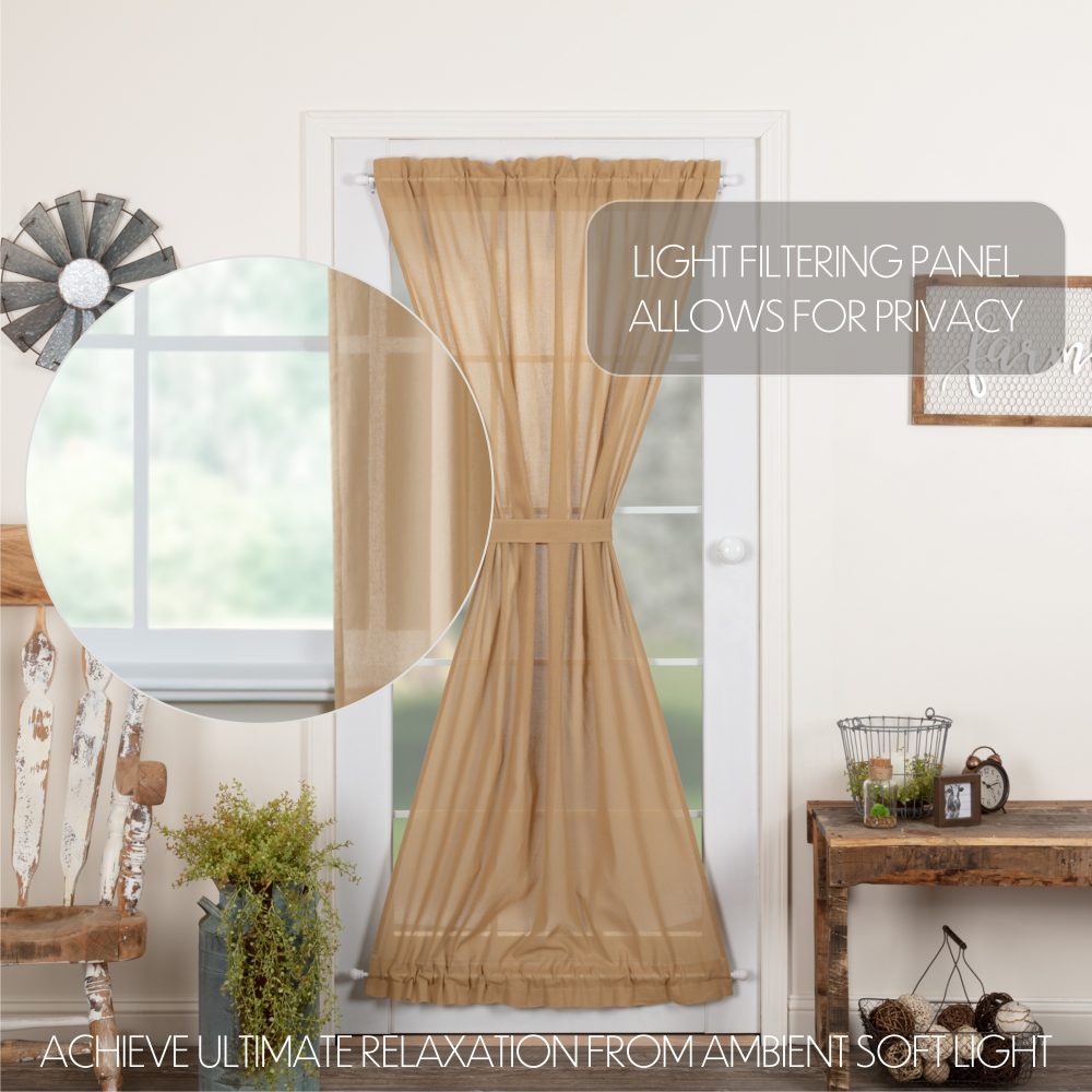The Tobacco Cloth Khaki Door Panel 72x40 brings an upscale farmhouse look to your home. Featuring a sheer, lightweight khaki tobacco cloth that adds elegance while still allowing light in. The rod pockets on this cottage door panel provides simple and easy installment and a secure fit while a matching tieback allows for style customization.