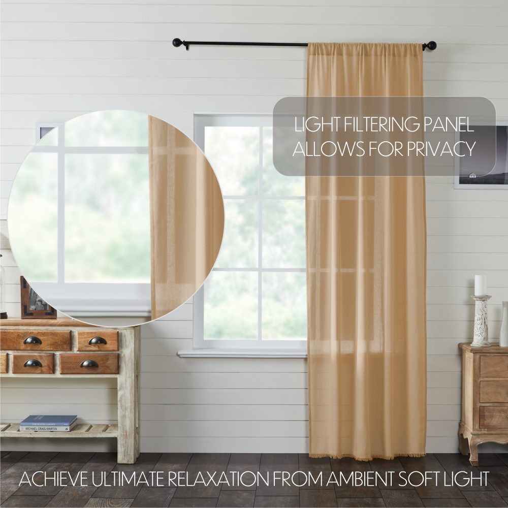 Let the light shine in while adding texture and polish to your home. The Tobacco Cloth Khaki Panel 96x40 brings a light and airy farmhouse look with lightweight tobacco cloth. The sheer fabric softly filters light creating a perfectly welcoming and bright environment. Features frayed edging and a rod pocket for easy hanging.