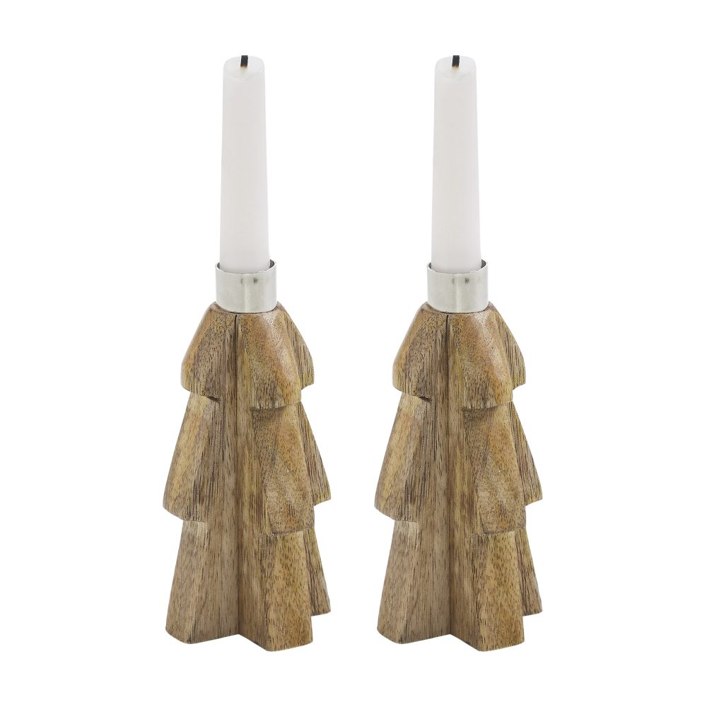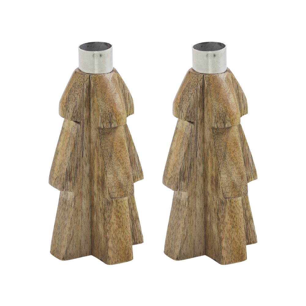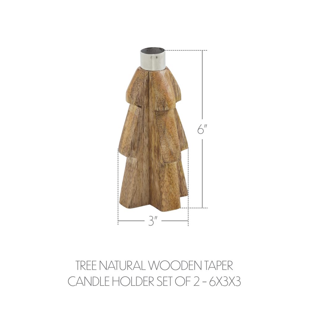 Bring warm, rustic charm to your seasonal decor with the VHC Brands Tree Wooden Taper Candle Holder Set of 2. Crafted from tropical wood, these unique candle holders are shaped like stylized trees in a light natural tan finish. At the top of each tree sits a sleek silver metal insert designed to securely hold a standard taper candle, blending natural textures with metallic contrast. The solid wood construction and clean silhouette give these holders a primitive, handcrafted appeal that's perfect for winter and holiday decorating. The mix of wood and metal offers a balanced, organic look that works well with farmhouse, rustic, or minimalist interiors. Whether displayed on a mantel, dining table, or entryway console, they add understated elegance to any space. Ideal for use in the bathroom, bedroom, dining room, entry, kitchen, or living room, this set of candle holders offers a versatile accent for the season. The neutral tones make them easy to style with other Christmas and winter decorations. For lasting beauty, simply wipe clean with a soft cloth after each use.