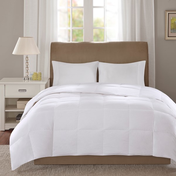 The True North Stain Release 3M Scotchgard 300 Thread Count Cotton Sateen White Down Comforter in level 1 is perfect for all-season use. The comforter is filled with high-quality 600 fill power 80% white down, 20% feather. Did you know that down provides approximately three times the warmth per ounce compared to even the best synthetic alternatives? Down is also breathable and helps to wick away moisture while you sleep. Our 300 thread count, 100% cotton sateen cover features 3M Scotchgard stain release which removes dirt easier in wash. The fabric remains soft and breathable while helping to keep your comforter looking newer longer. The end-to-end sewn-through box quilting ensures that the white down doesn’t shift, so you’ll never have any cold spots on the bed. Four corner loops on the comforter can be tied to help secure it within a duvet cover. This comforter is also OEKO-TEX certified, meaning it does not contain any harmful substances or chemicals, ensuring quality comfort and wellness. Items in the set may come in a rolled or compressed packaging, which will need to be fluffed up or steam ironed before use to remove wrinkles.