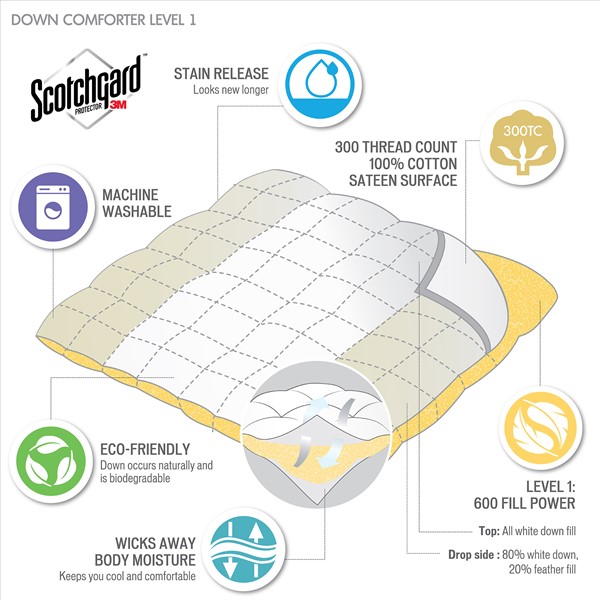 * Level 1 600 fill power 80% white down 20% feather fill