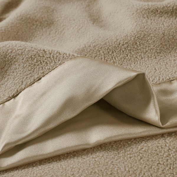 BODY: SOFT BRUSHED LIGHTWEIGHT MICRO FLEECE, 100% POLYESTER, ANTI-PILL, 2" MATTE SATIN 100% POLYESTER BINDING