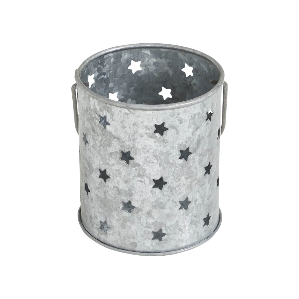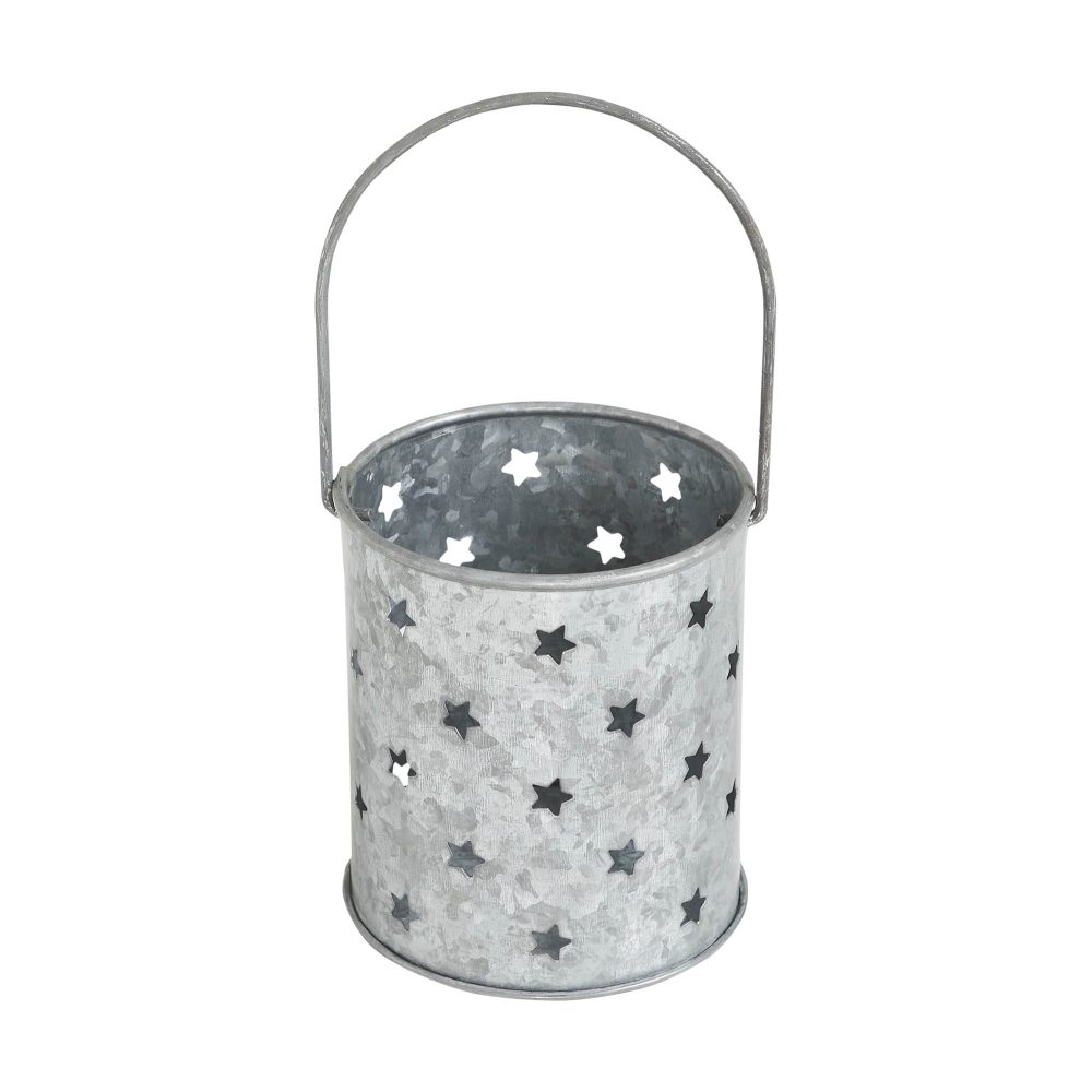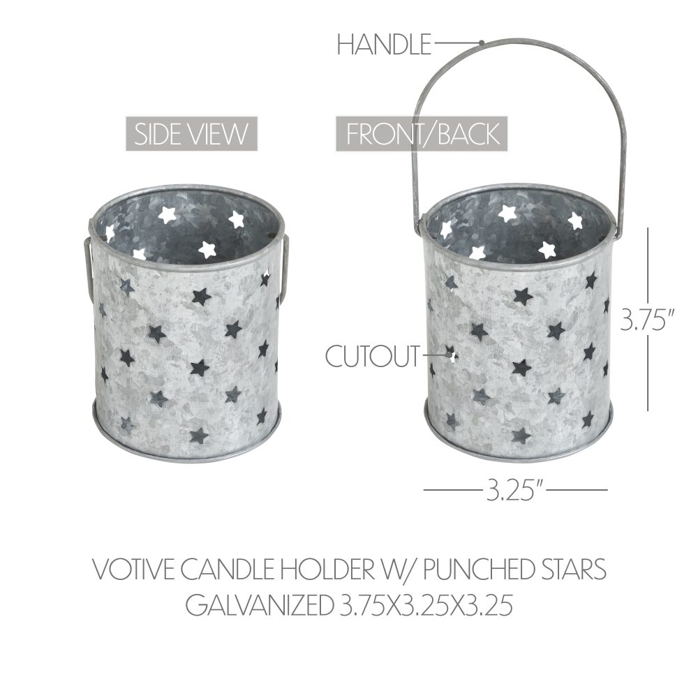Add a touch of rustic charm to your patriotic decor with the VHC Brands Patriotic Metal Votive Candle Holder w/ Punched Stars Galvanized 3.75x3.25x3.25. This round candle holder, crafted from sturdy galvanized grey metal, features a convenient carry handle for effortless placement. Its distinctive punched star design allows the warm glow of a votive candle to shine through, creating a cozy and inviting ambiance perfect for Fourth of July celebrations or everyday Americana-inspired decor. Ideal for enhancing any room, this versatile candle holder fits beautifully in living rooms, dining rooms, kitchens, bedrooms, bathrooms, or entryways. The galvanized grey finish, paired with its distressed appearance, blends seamlessly with rustic farmhouse and country-style interiors. Whether used as a standalone centerpiece or as part of a larger decorative arrangement, this piece brings warmth and character to your home. Maintaining the VHC Brands Patriotic Metal Votive Candle Holder is easy-simply wipe it clean with a soft cloth to preserve its electroplated finish and intricate punched star detailing. Whether celebrating Independence Day or adding a year-round accent, this votive holder combines quality craftsmanship, timeless design, and functional elegance. It's a stylish way to illuminate your space while showcasing your patriotic spirit.