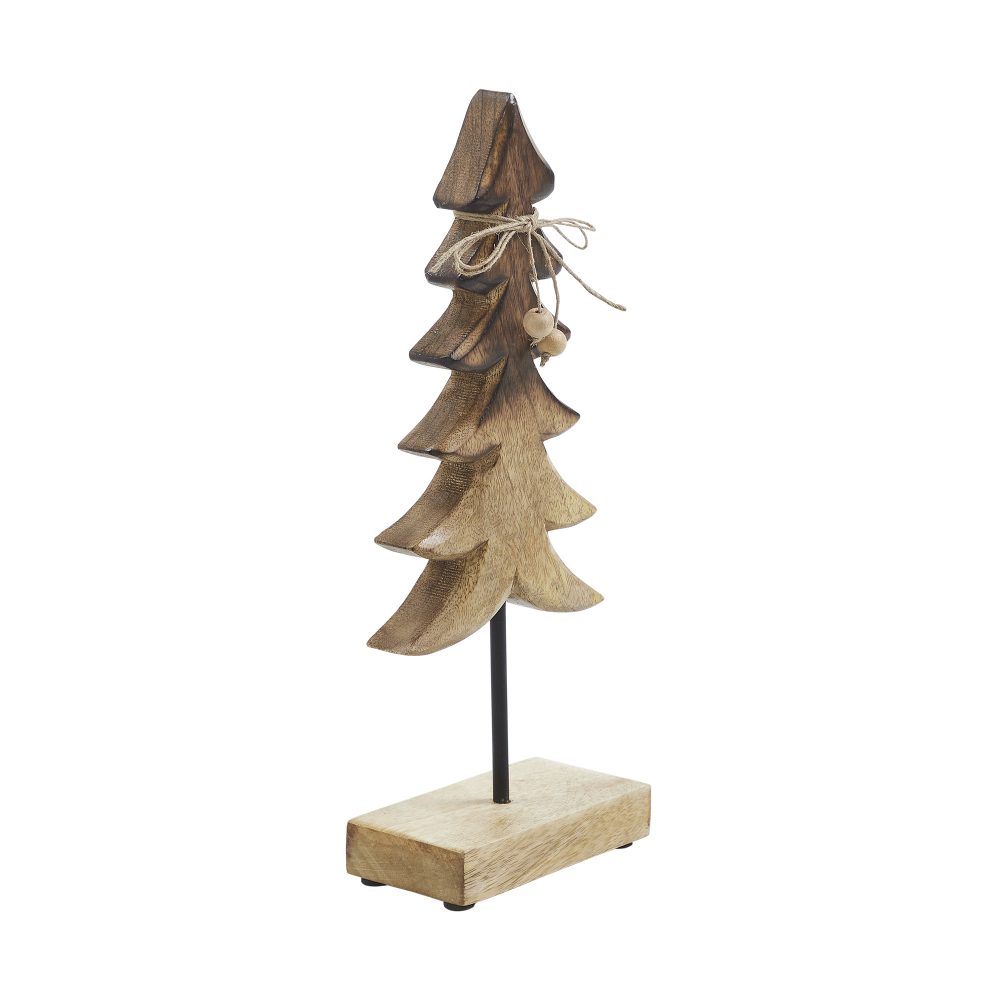 Add rustic charm to your holiday decor with the VHC Brands Two-Tone Wooden Christmas Tree in Medium. Made from tropical wood and accented with metal, this decorative figurine showcases a rich dark brown stain at the top that gradually fades into a light natural wood tone at the base. The two-tone stained finish and distressed appearance give it a primitive, handcrafted look that's perfect for wintertime decorating. Measuring 4.5 inches wide by 12 inches tall, this medium-sized tree is finished with thoughtful details like a twine bow with wood beads and a slender black metal stick stand mounted on a solid wood base. Its vertical profile makes it ideal for shelf styling, table centerpieces, or layered displays with other holiday decor. The contrast of light and dark tones brings visual interest while maintaining a warm, earthy aesthetic. Perfect for use in the bathroom, bedroom, dining room, entryway, kitchen, or living room, this seasonal tree blends seamlessly with farmhouse, rustic, or traditional interiors. Its neutral colors and natural materials offer timeless appeal that enhances your winter atmosphere. For care and longevity, simply wipe clean with a soft cloth to maintain its festive beauty year after year.