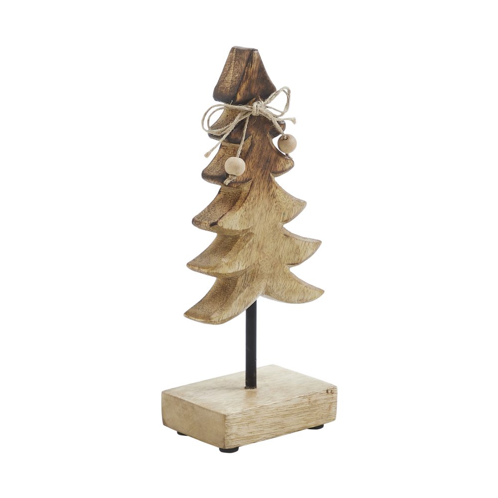 Bring a cozy, handcrafted feel to your winter decor with the VHC Brands Two-Tone Wooden Christmas Tree in Small. Made from tropical wood and accented with metal, this charming figurine features a dark brown stain at the top that gradually fades into a light natural wood tone at the bottom. The two-tone design and distressed finish give it a warm, primitive appeal that's perfect for rustic holiday styling. Measuring 3.5 inches wide by 9 inches tall, this compact tree includes a twine bow with wooden beads for a festive touch, along with a sleek black metal stick stand and a sturdy wood base for stable display. Its size makes it ideal for layering with other decorative trees or placing on shelves, mantels, and countertops where space is limited but style still matters. Whether displayed in the bathroom, bedroom, dining room, entryway, kitchen, or living room, this small winter tree adds character and texture to your seasonal setup. Its neutral palette and natural materials complement a variety of interior themes, from farmhouse to traditional. For care, simply wipe clean with a soft cloth to preserve its rustic charm for years to come.