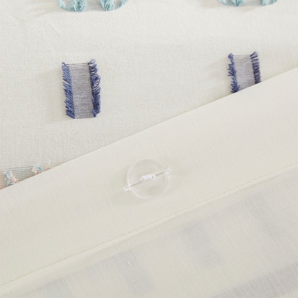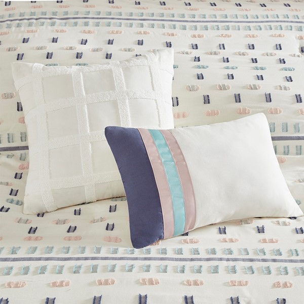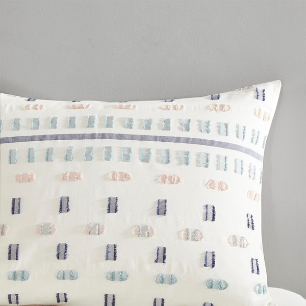 The Urban Habitat Auden 5 Piece Cotton Jacquard Duvet Cover Set offers a chic contemporary update to your bedroom decor. This cotton jacquard duvet cover features multicolor clipped stripes in blue, aqua, and pink on a light ivory ground for a textural modern look. Two matching shams mirror the design of the duvet cover, while a square and an oblong pillow provide the perfect finishing touches to the casual duvet cover set. This bedding set is OEKO-TEX certified, meaning it does not contain any harmful substances or chemicals to ensure quality comfort and wellness. Button closures on the duvet cover secure a comforter insert (NOT included) within the duvet cover and internal corner ties prevent it from shifting.