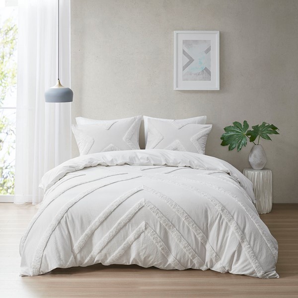 Refresh your bedroom with the bold and modern allure of the Urban Habitat Beck Cotton Chenille Duvet Cover Set. This ivory cotton duvet cover features a large scale chenille geometric design to create an eye-catching look. The 2 coordinating shams (1 in Twin/TwinXL) pair handsomely with the top of the bed to complete the geometric duvet cover set. This bedding set is also OEKO-TEX certified, meaning it does not contain any harmful substances or chemicals to ensure quality comfort. Machine washable for easy care. A button closure at the foot end secures a padded insert within the duvet cover and inside corner ties prevent it from shifting (insert is NOT included).