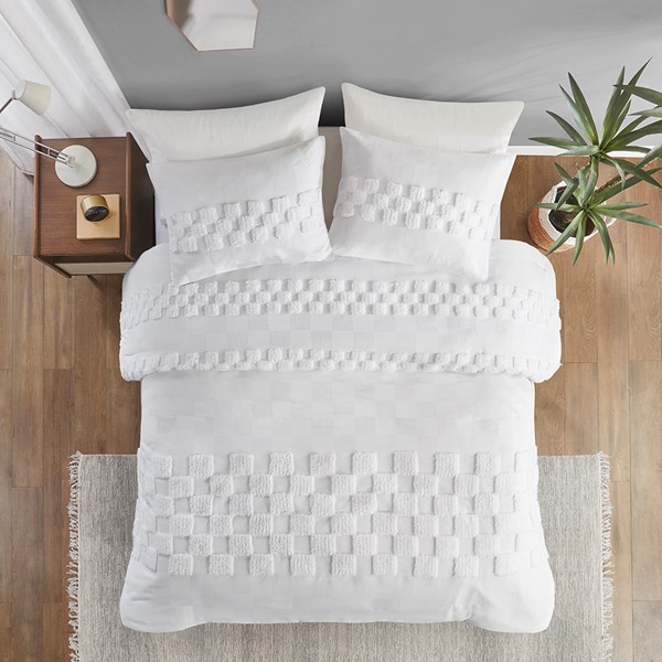 The Bennett duvet cover set features a unique checkered pattern with clipped chenille for a modern, sophisticated look. This off-white duvet cover adds a contemporary update to your bedroom, while coordinating shams complete the bedding set. This duvet cover set is also machine washable for easy care. Inserts for duvet covers are sold separately.