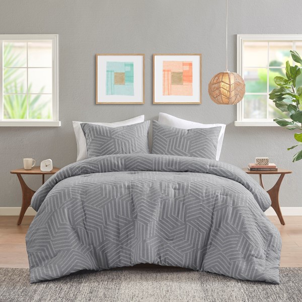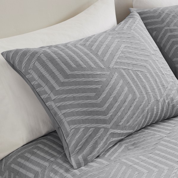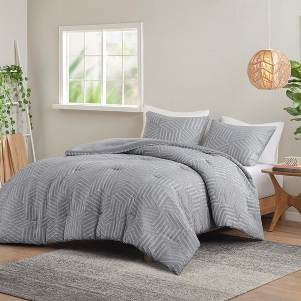 Featuring a tonal geometric design, the Urban Habitat Bentley matelasse jacquard comforter set adds a modern and sophisticated style to your bedroom. The grey blue comforter has a soft microfiber reverse, while coordinating shams complete the look of the bedding set. The comforter is filled with hypoallergenic polyester filling that is treated to be dustproof, ensuring a restful and comfortable sleeping experience. Plus, this comforter set has an antimicrobial treatment to keep the bedding fresher for longer by inhibiting bacteria growth and is machine washable for easy care.
