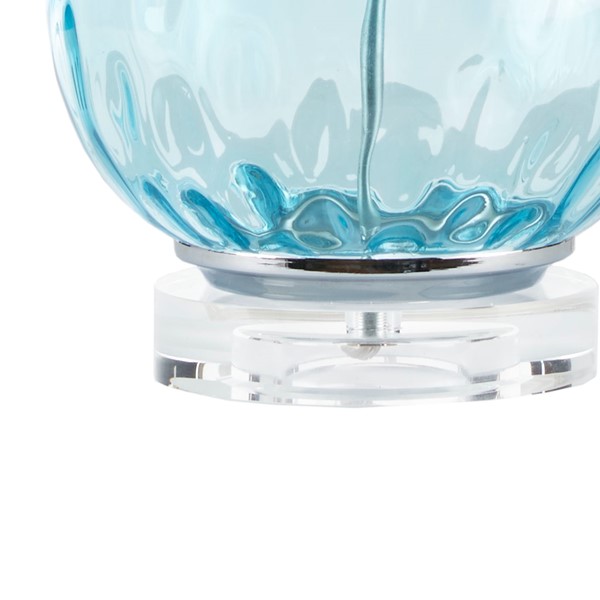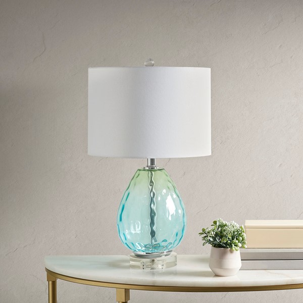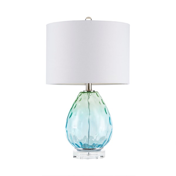 510 Design Borel Ombre Glass Table Lamp. Beautifully designed, this glass table lamp flaunts a gorgeous blue and green hue that adds a soft touch of color to your room. The white drum-shaped lamp shade tastefully accents the base, while softly filtering the light to give off a warm glow. Plug in to a power source using the 72-inch clear cord and illuminate your decor by flipping the on/off switch located on the socket. Eye-catching and unique, this glass table lamp offers a chic update to your living room or bedroom. One Type A light bulb is needed and included. Comes with a 2-year warranty.