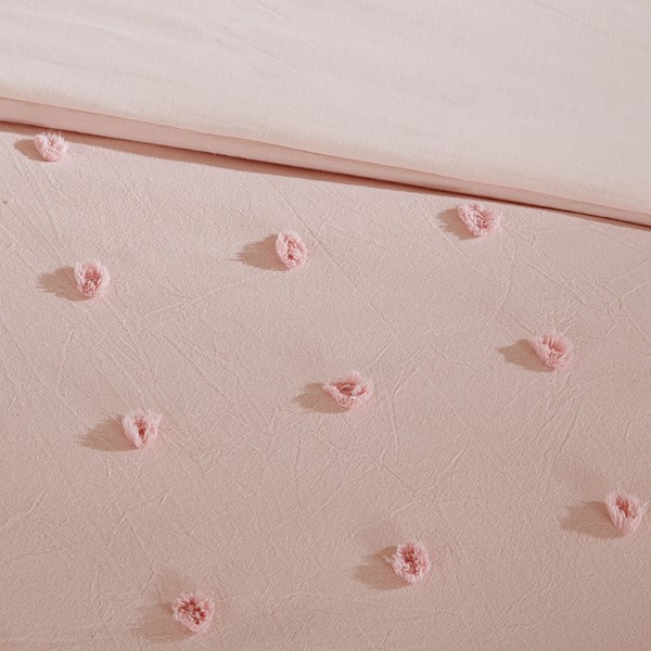 The Urban Habitat Brooklyn Cotton Jacquard Duvet Cover Set features small tufted chenille dots that create a fresh shabby chic look. This duvet cover set brings a soft and charming update to your bedroom, while matching shams (1 in Twin/TwinXL) and quilted Euro shams (1 in Twin/TwinXL) complement the cotton jacquard duvet cover set. Two decorative pillows are also included, adding the finishing touches. This duvet cover set is also OEKO-TEX certified and is machine washable for easy care. A button closure at the foot end allows you to place a padded insert within the duvet cover and internal corner ties prevent it from shifting. Inserts for duvet covers are sold separately.