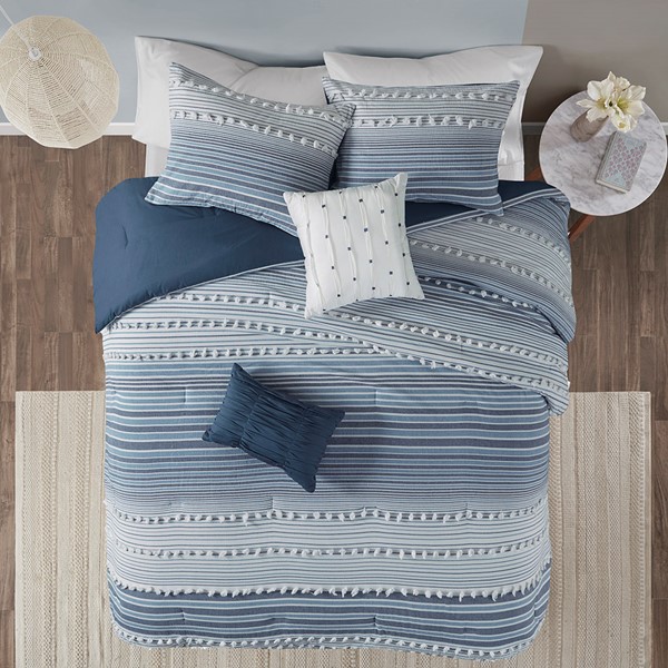 Give your bedroom a soft casual update with the Urban Habitat Calum Cotton Jacquard Comforter Set. The cotton clipped jacquard comforter features yarn-dyed stripes of blue, indigo, and off-white, for a soft and alluring look. Matching shams (1 for Twin Sizes) mirror the design seen on top of the bed, while two decorative pillows add the finishing touches to the bed. Hypoallergenic polyester filling in the comforter and pillows provides exceptional warmth and comfort. This bedding set is also OEKO-TEX certified, meaning it does not contain any harmful substances or chemicals to ensure quality comfort and wellness. Easy to coordinate with, this cotton jacquard comforter set brings a rich textural look and feel to your bedroom decor and is machine washable for easy care.