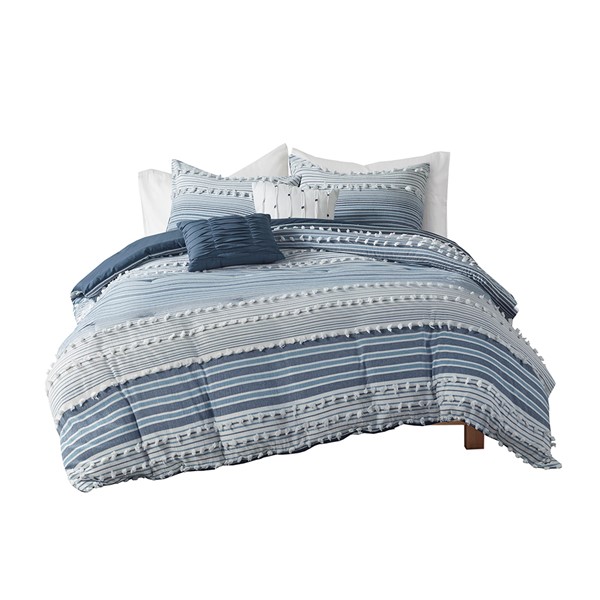 Give your bedroom a soft casual update with the Urban Habitat Calum Cotton Jacquard Comforter Set. The cotton clipped jacquard comforter features yarn-dyed stripes of blue, indigo, and off-white, for a soft and alluring look. Matching shams (1 for Twin Sizes) mirror the design seen on top of the bed, while two decorative pillows add the finishing touches to the bed. Hypoallergenic polyester filling in the comforter and pillows provides exceptional warmth and comfort. This bedding set is also OEKO-TEX certified, meaning it does not contain any harmful substances or chemicals to ensure quality comfort and wellness. Easy to coordinate with, this cotton jacquard comforter set brings a rich textural look and feel to your bedroom decor and is machine washable for easy care.