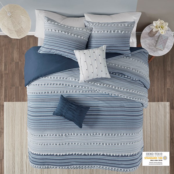 Give your bedroom a soft casual update with the Urban Habitat Calum Cotton Jacquard Duvet Cover Set. The cotton clipped jacquard duvet cover features yarn-dyed stripes of blue, indigo, and off-white, for a soft and alluring look. Matching shams (1 for Twin Sizes) mirror the design seen on top of the bed, while two decorative pillows with hypoallergenic polyester filling add the finishing touches to the bed. This bedding set is also OEKO-TEX certified, meaning it does not contain any harmful substances or chemicals to ensure quality comfort and wellness. Easy to coordinate with, this cotton jacquard duvet cover set brings a rich textural look and feel to your bedroom decor and is machine washable for easy care. Button closures on the duvet cover secure a comforter insert (NOT included) within the duvet cover and internal corner ties prevent it from shifting.