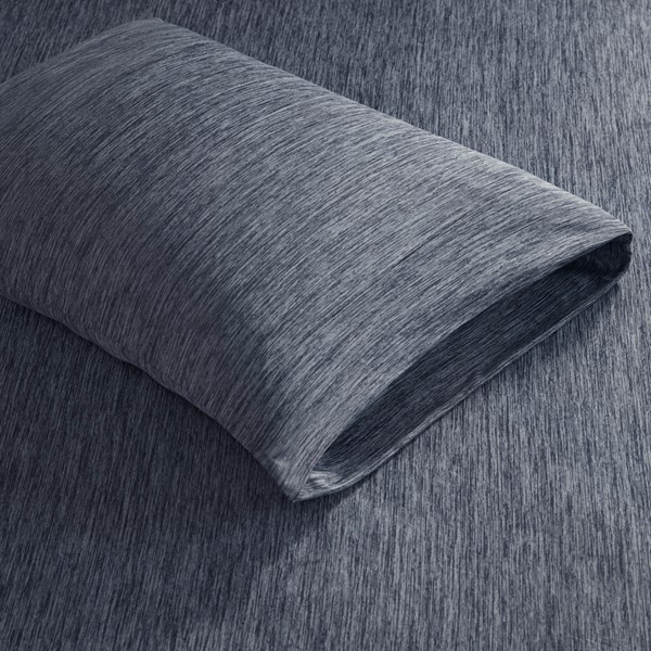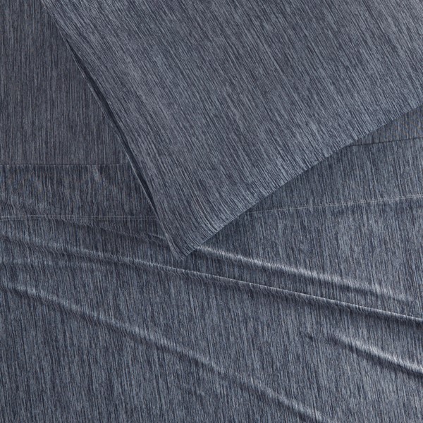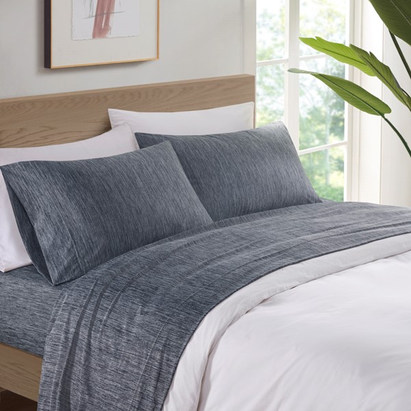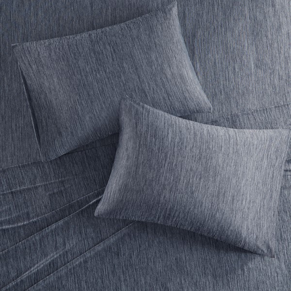 Dive into this cool and comfortable jersey knit sheet set. Made from 50% nylon and 50% polyester, this blended fabric feels cool and breathable to even the hottest of sleepers. This silky smooth sheet set features heathered yarns to create a chic tonal look that pairs easily with any bedding set. Set includes 1 flat sheet, 1 fitted sheet and 2 pillowcases (1 in Twin size). Machine washable for easy care and wrinkle resistant. Fitted sheet fits up to 16″ of mattresses.