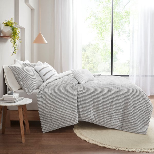 Create a space of pure relaxation and comfort with the Urban Habitat Hayden 5 Piece Plush Clip Jacquard Duvet Cover Set. This solid grey plush clipped jacquard duvet cover features soft dots all over the top of bed, for a unique texture and look. The 2 matching shams pair perfectly with the cozy modern duvet cover, while 1 square and 1 oblong decorative pillow add sophisticated finishing touches. Machine washable for easy care, this modern duvet cover set also uses an antimicrobial treatment that provides built-in freshness protection, reducing the growth of odor causing bacteria to keep fabric lasting longer. A button closure at the foot end secures a padded insert within the duvet cover and inside corner ties prevent it from shifting (insert is NOT included). Items in the set may come in a rolled or compressed packaging, which will need to be fluffed up or steam ironed before use to remove wrinkles.